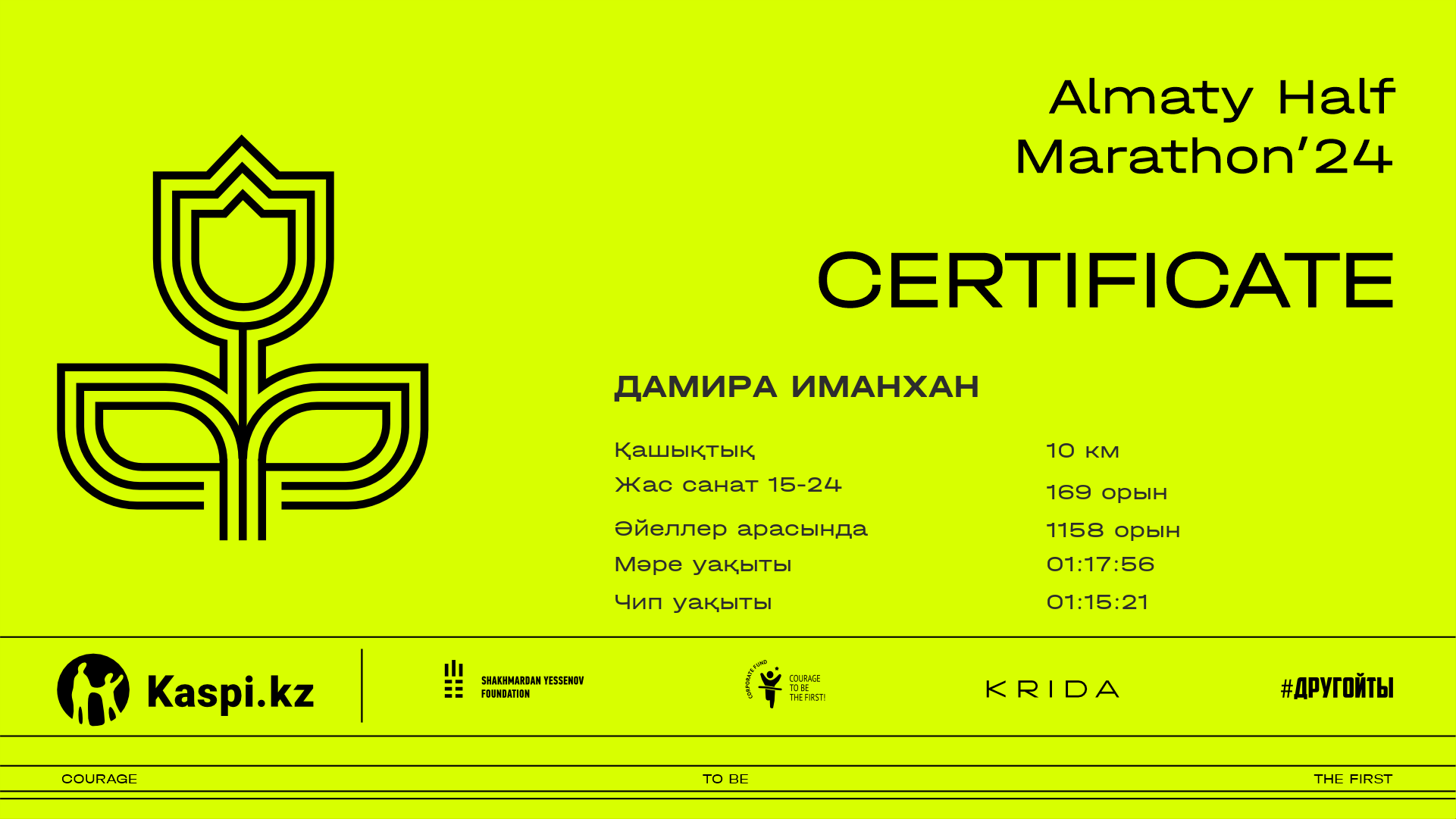 | 3009 | Дамира Иманхан | ![]() | Алматы | 5636 | 00:53:31 | 01:17:56 | 01:15:21 | Жүктеп алу |