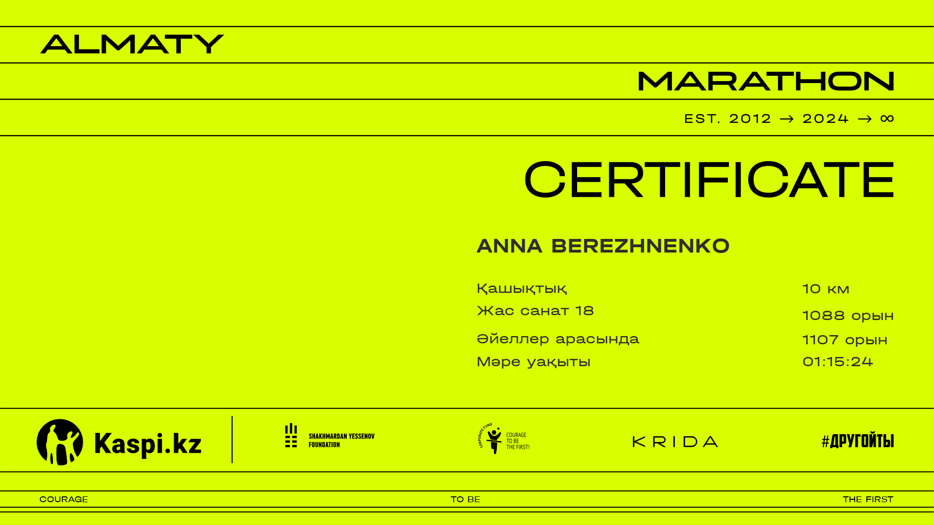 | 3262 | Anna Berezhnenko | ![]() | Алматы | 9258 | 00:57:05.01 | 01:15:24.48 | 01:12:12.99 | Жүктеп алу |