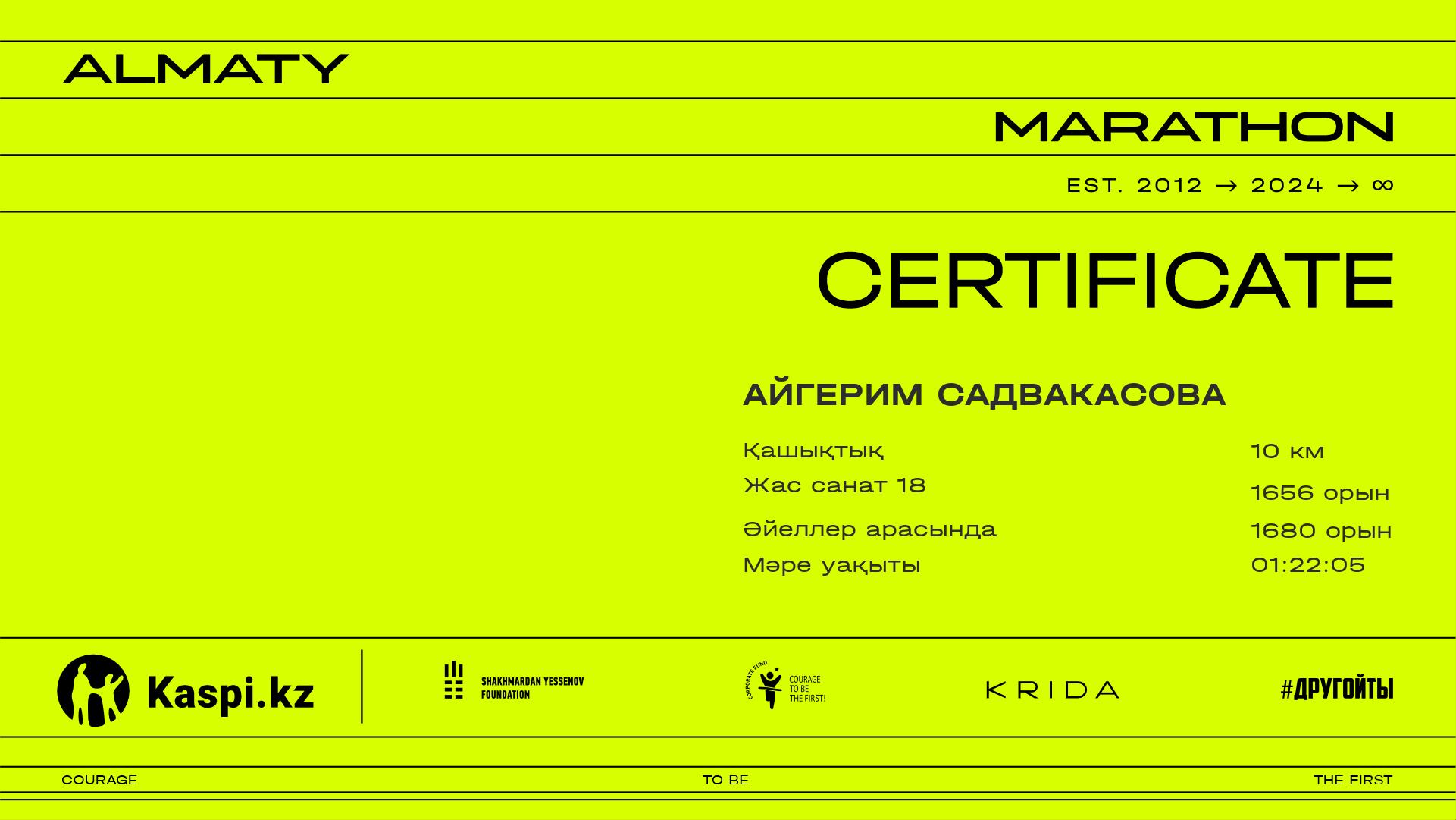 | 4421 | Индира Жидебаева | ![]() | Алматы | 5736 | 01:03:08.92 | 01:24:41.67 | 01:20:31.02 | Жүктеп алу |