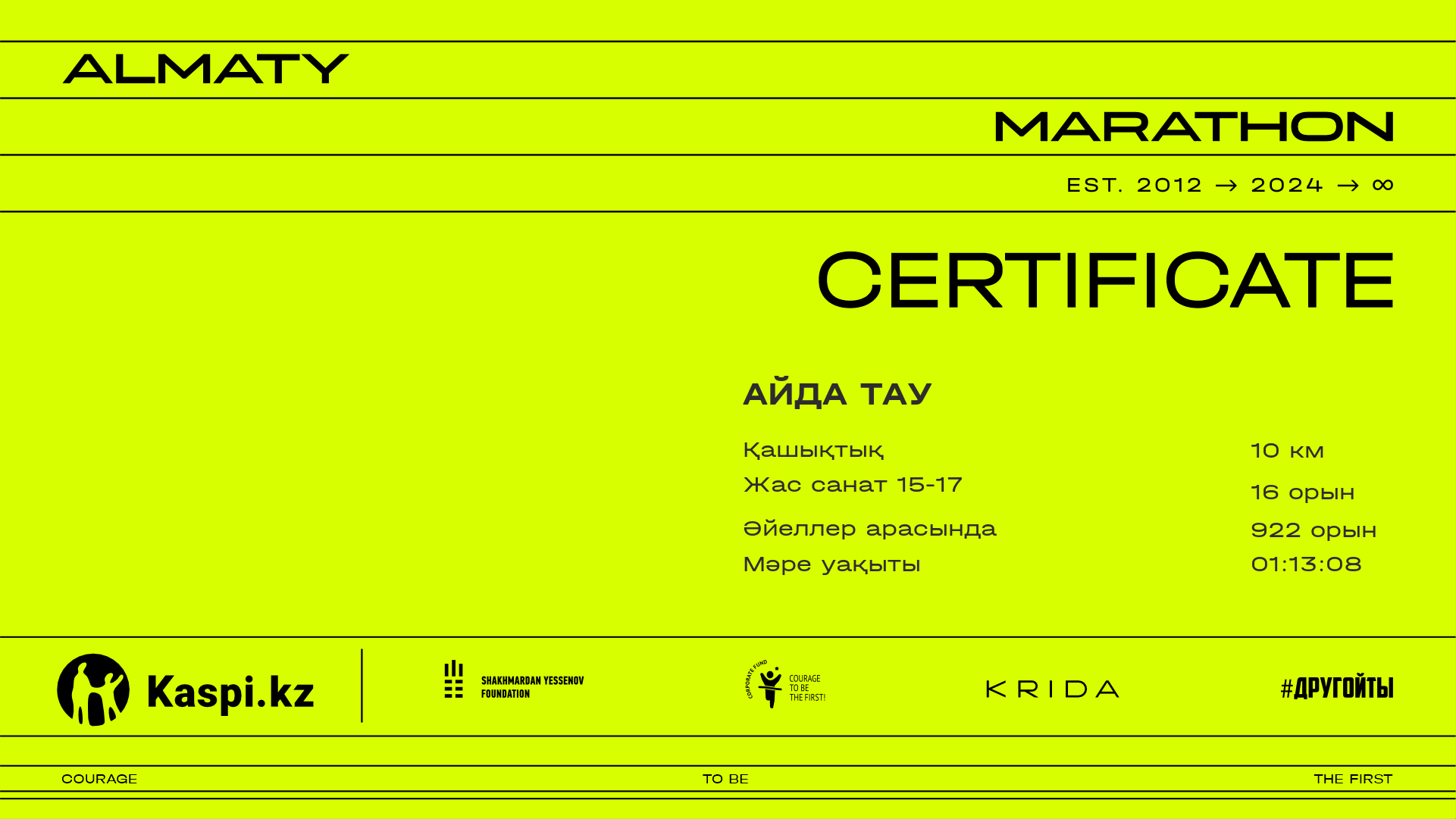 | 2027 | Жеңісбай Қабаржан | ![]() | Алматы | 4833 | 00:51:29.44 | 01:07:08.46 | 01:04:31.29 | Жүктеп алу |