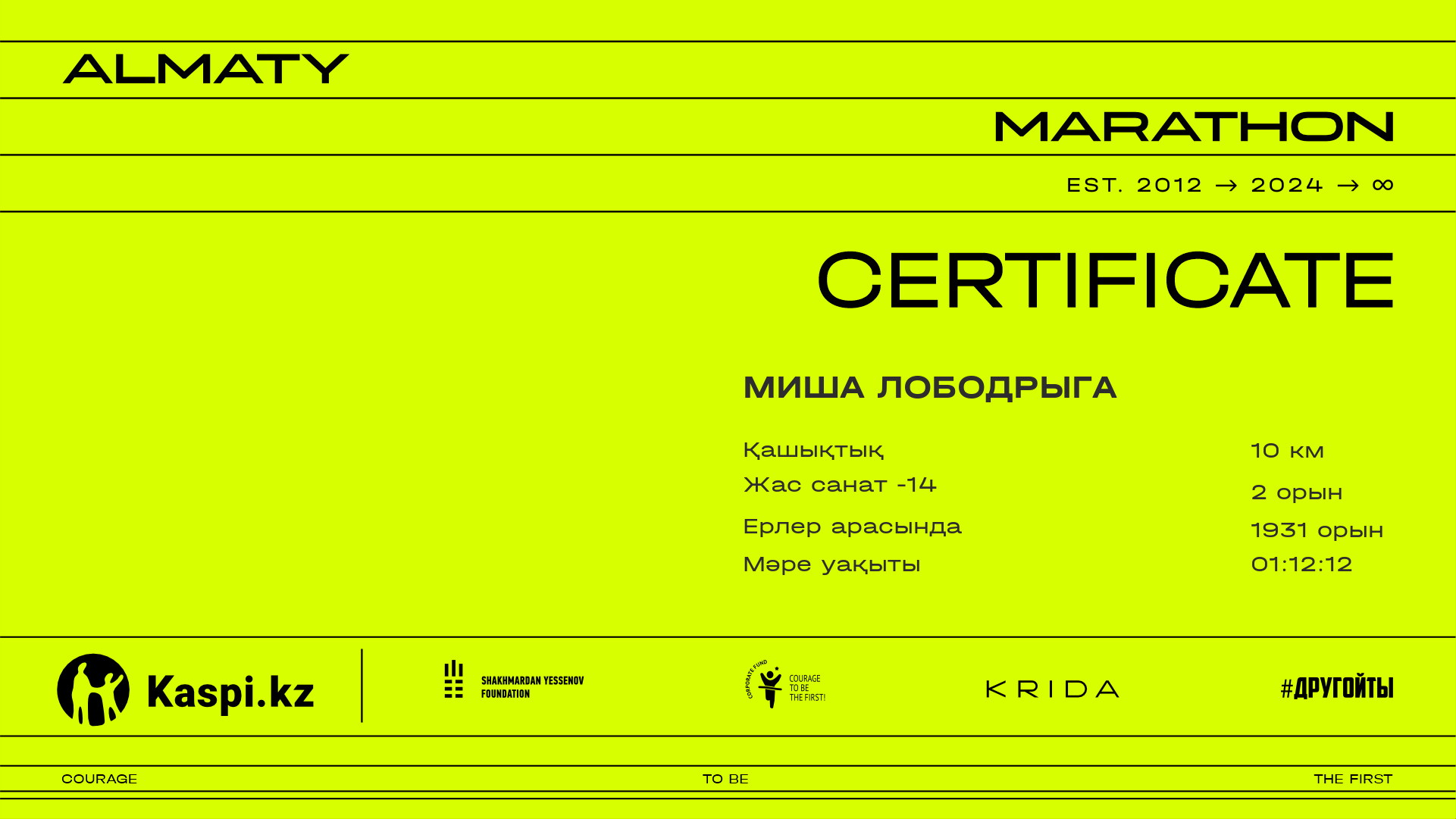| 2766 | Миша Лободрыга | ![]() | Алматы | 8709 | 00:53:00.99 | 01:12:12.04 | 01:11:34.37 | Жүктеп алу |
