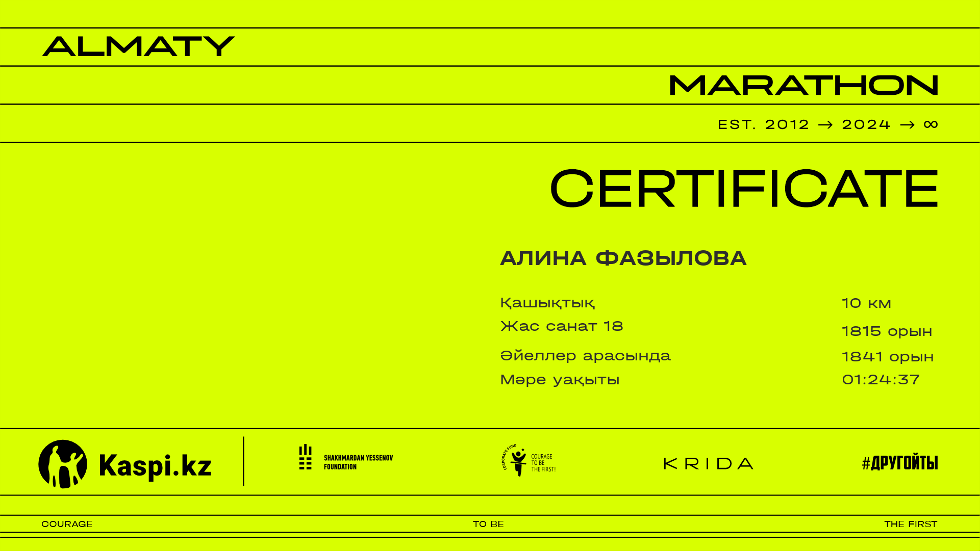| 4574 | Madi Kadrushev | ![]() | Almaty | 10832 | 01:04:13.96 | 01:26:15.94 | 01:26:15.94 | Жүктеп алу |