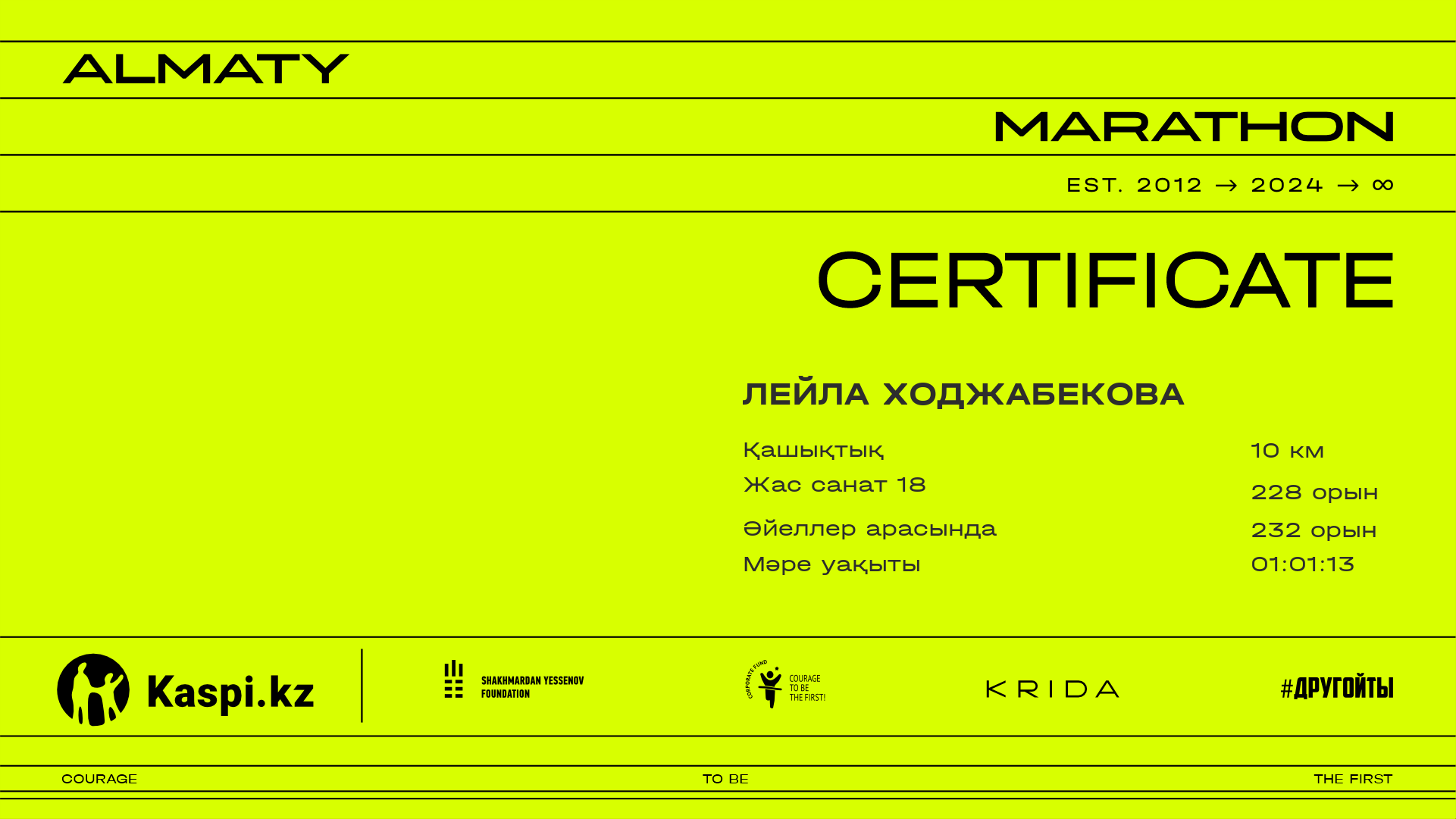 | 3692 | Ернияз Заманбек | ![]() | Алматы | 3660 | 00:57:50.36 | 01:18:16.95 | 01:15:19.54 | Жүктеп алу |