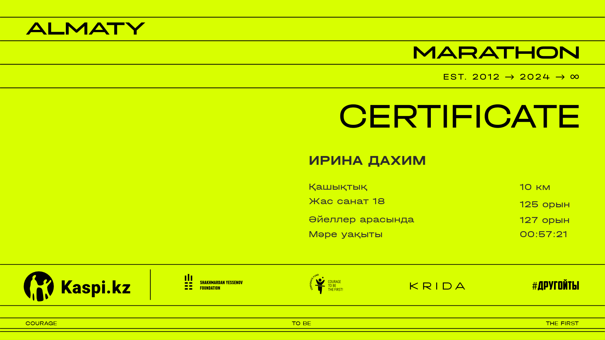 | 816 | Ирина Дахим | ![]() | Алматы | 8626 | 00:42:44.50 | 00:57:21.36 | 00:56:38.75 | Жүктеп алу |