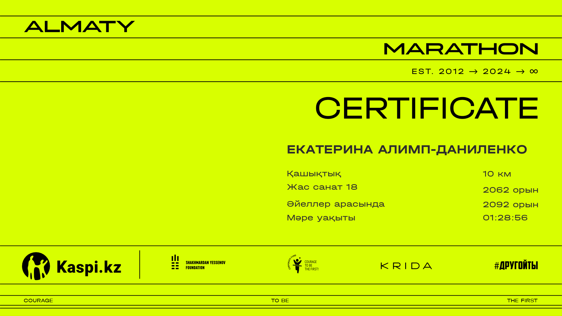 | 4775 | Екатерина Алимп-Даниленко | ![]() | Алматы | 4655 | 01:04:21.41 | 01:28:56.84 | 01:25:25.64 | Жүктеп алу |