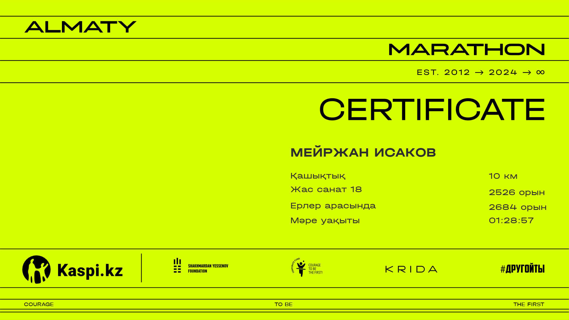 | 4777 | Мейржан Исаков | ![]() | Алматы | 9096 | 01:06:51.36 | 01:28:57.43 | 01:26:42.47 | Жүктеп алу |