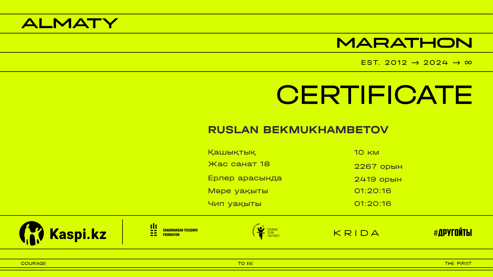 | 2667 | Абзал Турганбек | ![]() | Алматы | 9607 | 00:53:42.32 | 01:11:36.39 | 01:07:21.30 | Жүктеп алу |