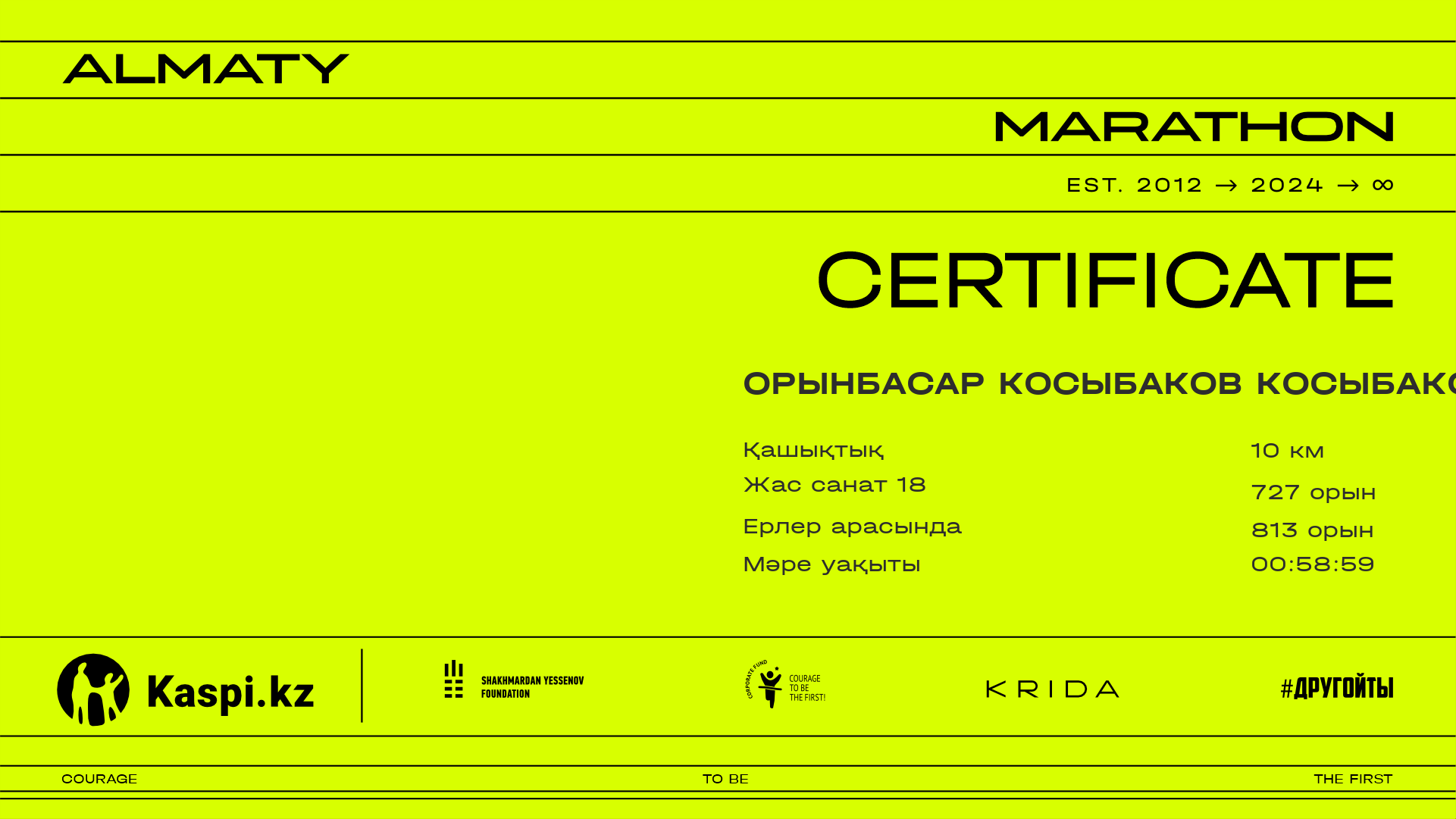 | 982 | Орынбасар Косыбаков Косыбаков | ![]() | Алматы | 9553 | 00:43:53.45 | 00:58:59.82 | 00:58:18.01 | Жүктеп алу |