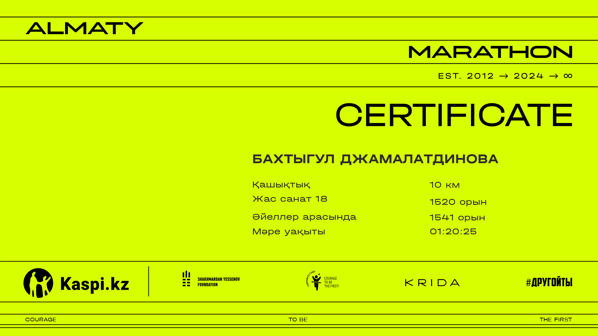| 5005 | Салтанат Тюребаева | ![]() | Алматы | 3952 | 01:10:32.84 | 01:32:40.34 | 01:30:18.08 | Жүктеп алу |