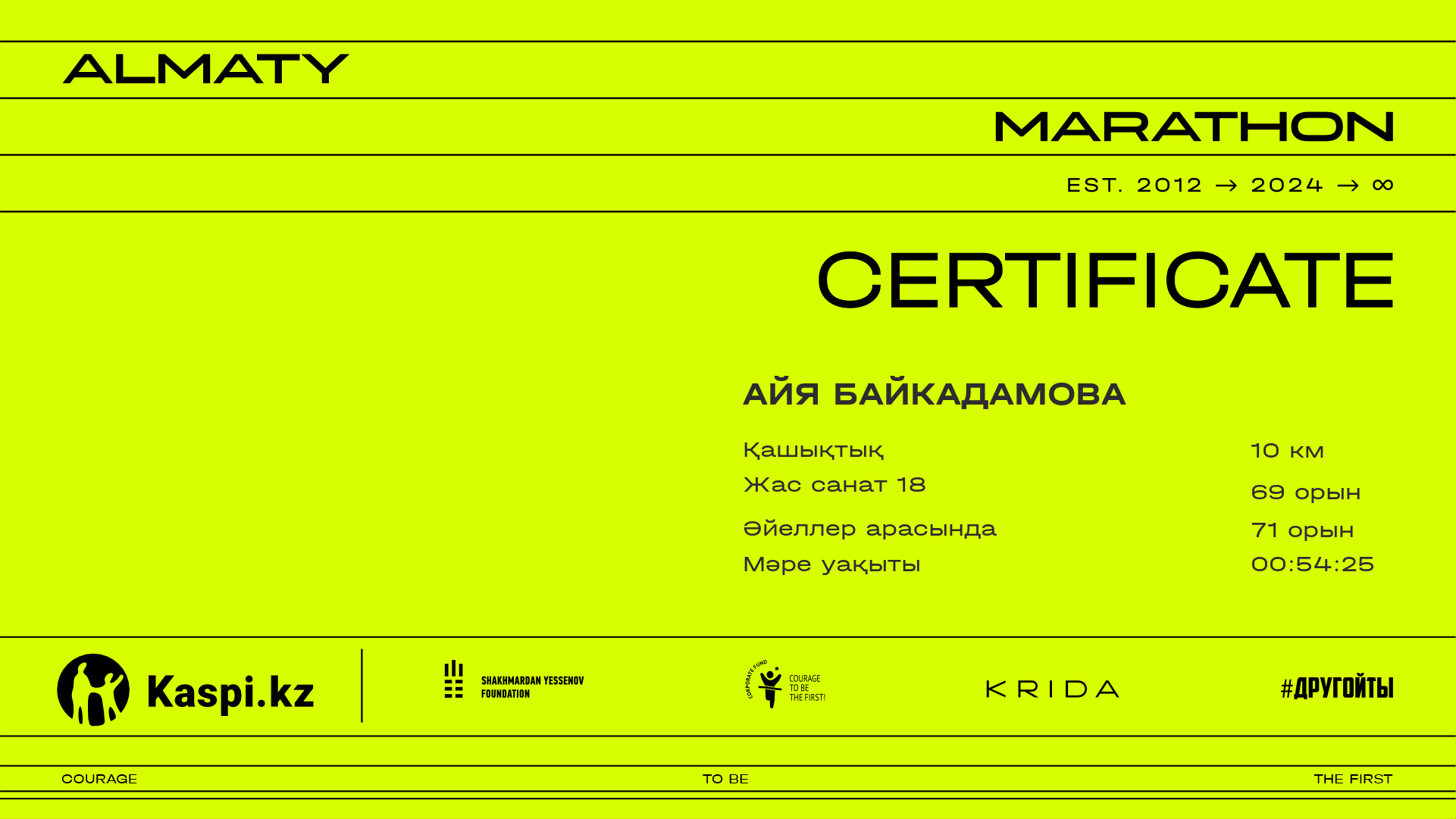 | 655 | Нургали Оспанов | ![]() | Алматы | 10162 | 00:41:33.85 | 00:55:43.39 | 00:54:09.36 | Жүктеп алу |