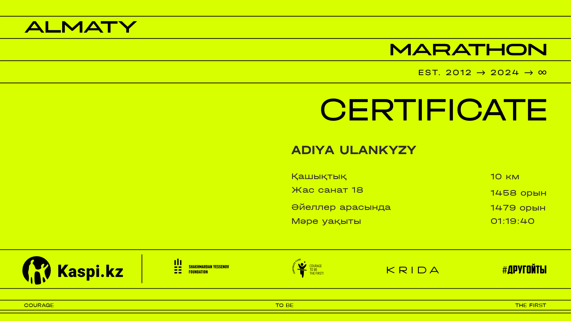 | 3878 | ADIYA Ulankyzy | ![]() | Almaty | 5761 | 00:59:09.00 | 01:19:40.05 | 01:16:58.38 | Жүктеп алу |