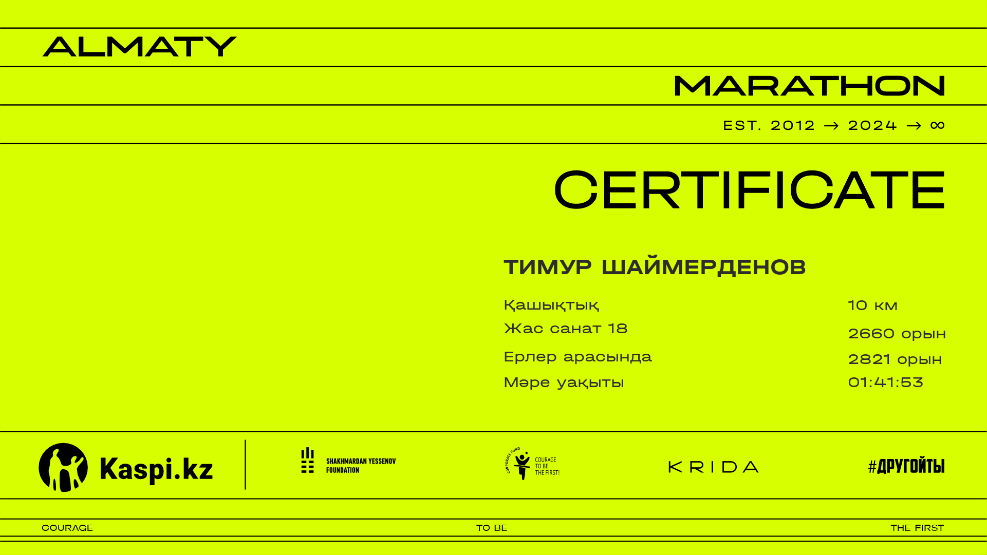 | 5344 | Тимур Шаймерденов | ![]() | Алматы | 8505 | 01:20:38.11 | 01:41:53.67 | 01:41:53.67 | Жүктеп алу |