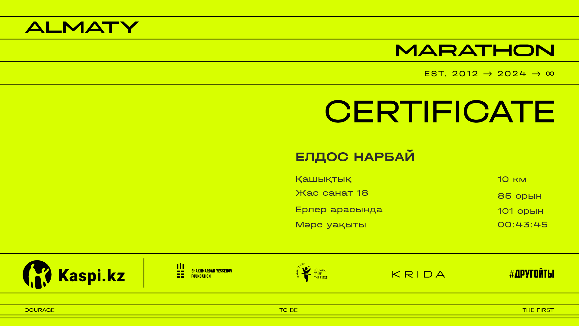 | 108 | Мурат Жабаев | ![]() | Алматы | 9592 | 00:31:31.38 | 00:43:37.31 | 00:43:34.97 | Жүктеп алу |