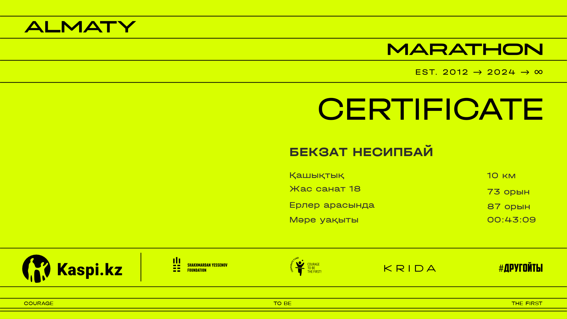 | 97 | Бекзат Несипбай | ![]() | Алматы | 7573 | 00:31:25.45 | 00:43:09.89 | 00:42:55.80 | Жүктеп алу |