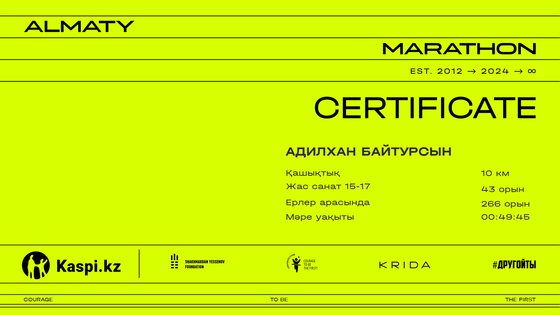 | 308 | Sultan Serikzhan | ![]() | Almaty | 4301 | 00:36:40.79 | 00:49:54.11 | 00:49:08.93 | Жүктеп алу |