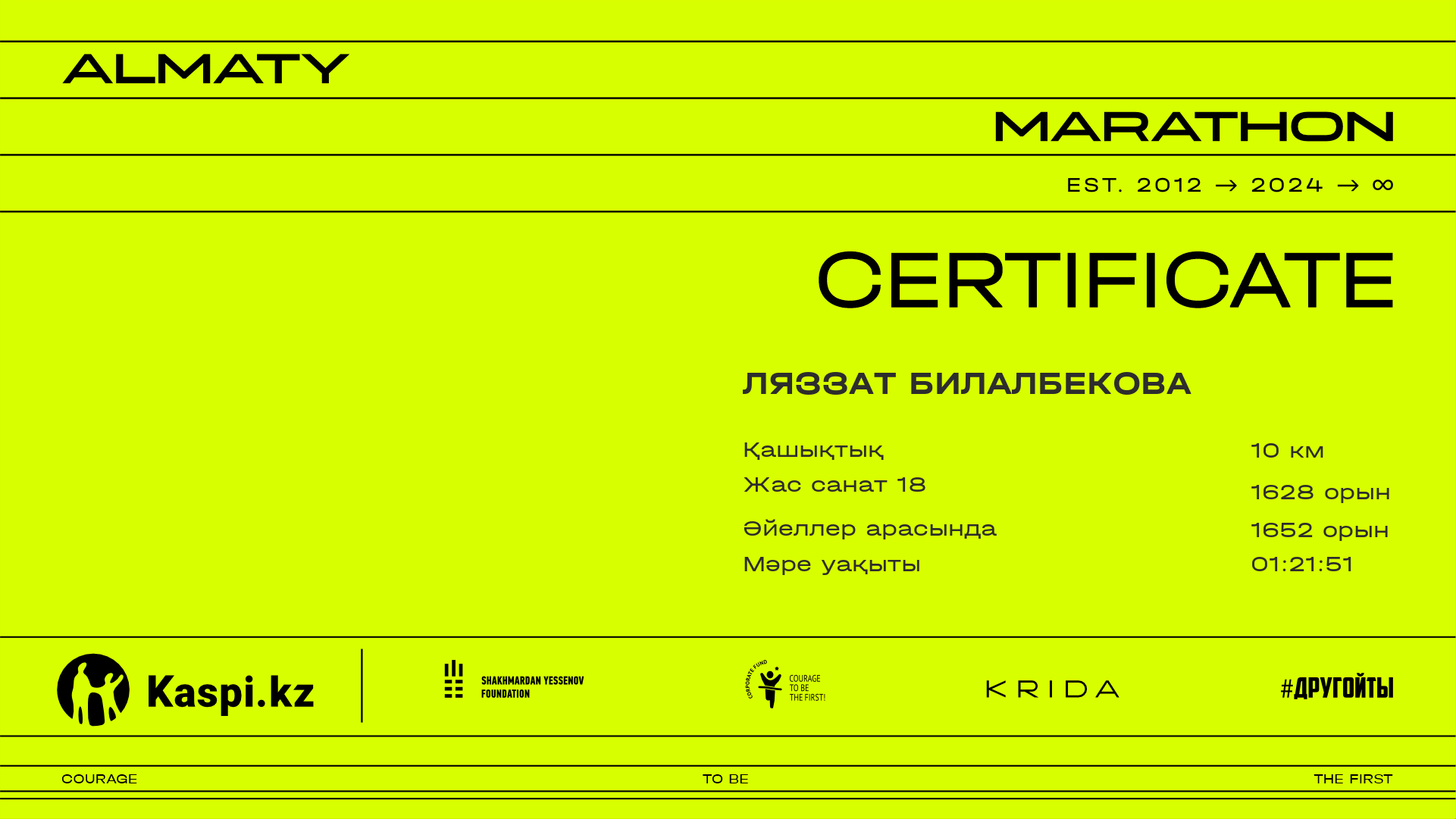 | 2441 | Асем Марат | ![]() | Алматы | 5093 | 00:50:05.04 | 01:10:02.08 | 01:09:50.44 | Жүктеп алу |