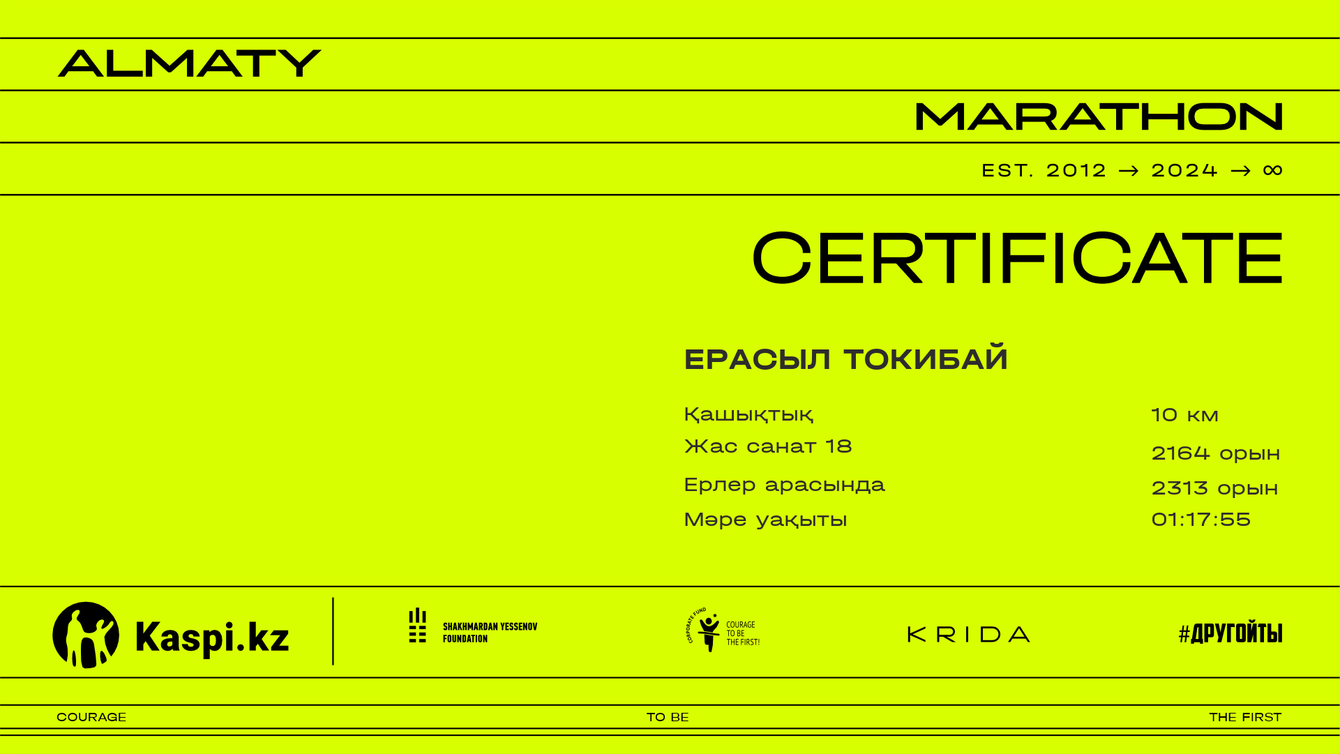| 3692 | Ернияз Заманбек | ![]() | Алматы | 3660 | 00:57:50.36 | 01:18:16.95 | 01:15:19.54 | Жүктеп алу |