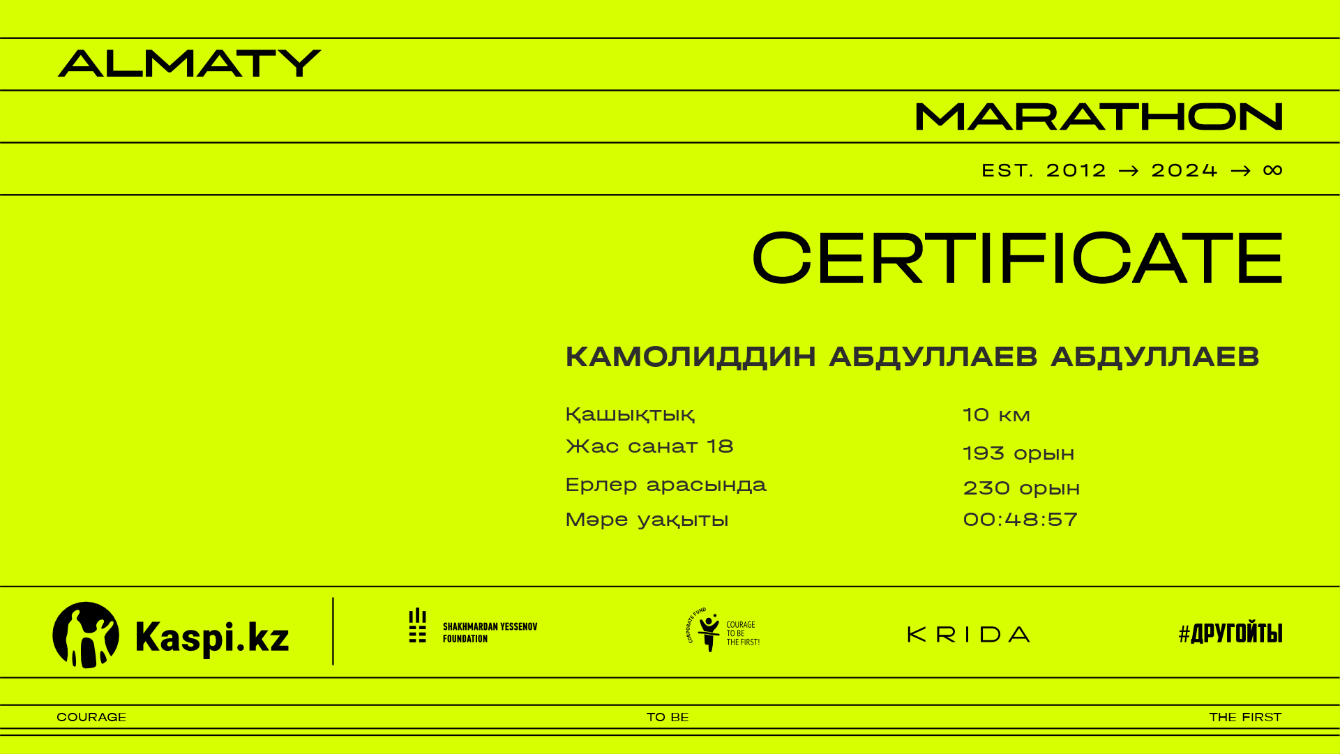 | 267 | Алдияр Амангельды | ![]() | Алматы | 5833 | 00:35:35.44 | 00:49:14.17 | 00:48:45.79 | Жүктеп алу |