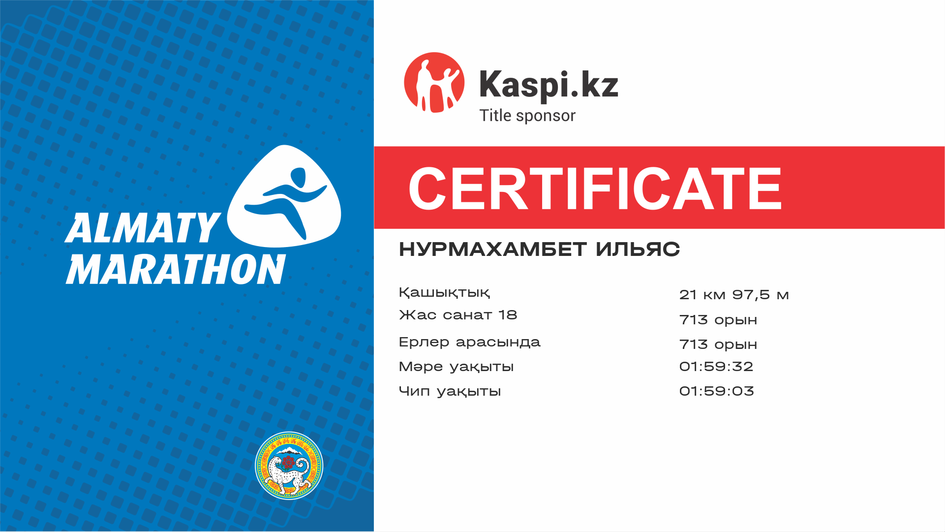 | 210 | Нурлан Серикбол | ![]() | Алматы | 3362 | 00:59:02 | 01:29:26 | 01:42:32 | 01:42:30 | Жүктеп алу |