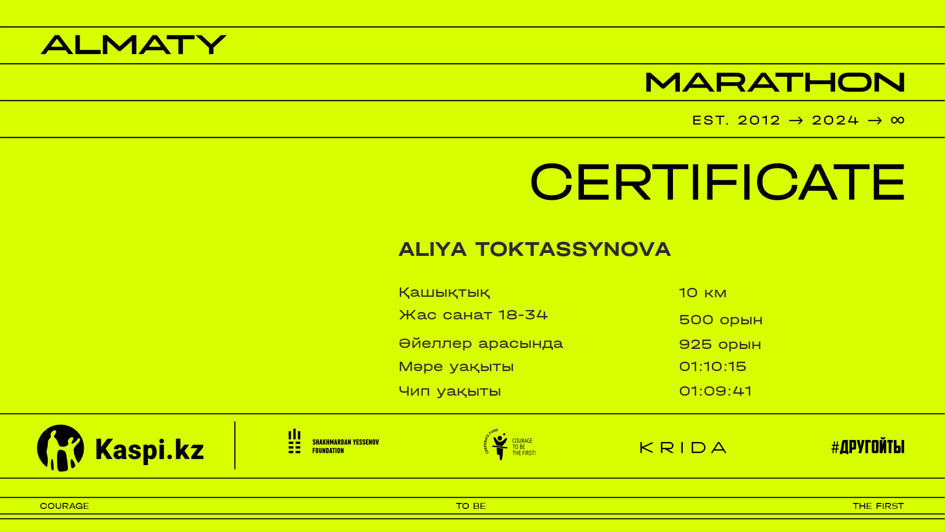 | 5877 | Aliya Kaisar | ![]() | Алматы | 7035 | 01:14:06.84 | 01:22:49.38 | 01:18:42.14 | Жүктеп алу |