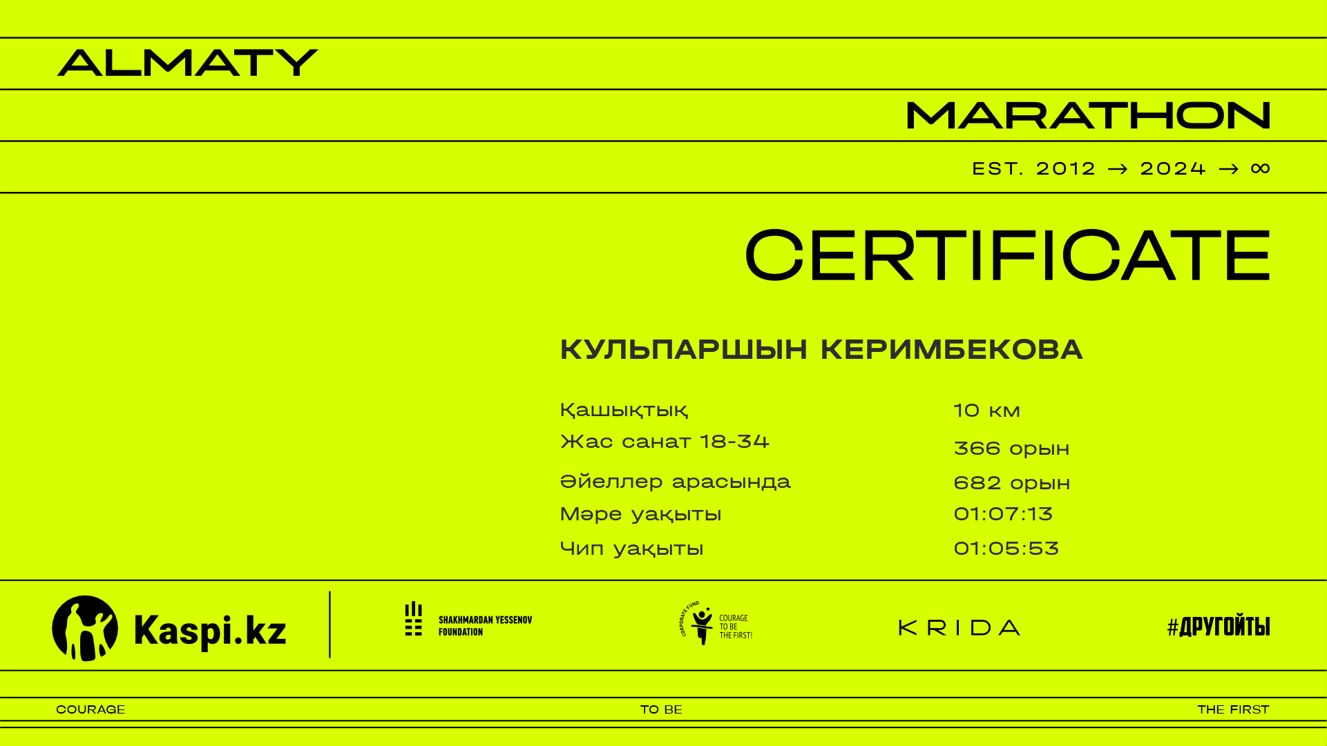 | 2752 | Кульпаршын Керимбекова | ![]() | Алматы | 6092 | 00:58:36.39 | 01:07:13.24 | 01:05:53.92 | Жүктеп алу |
