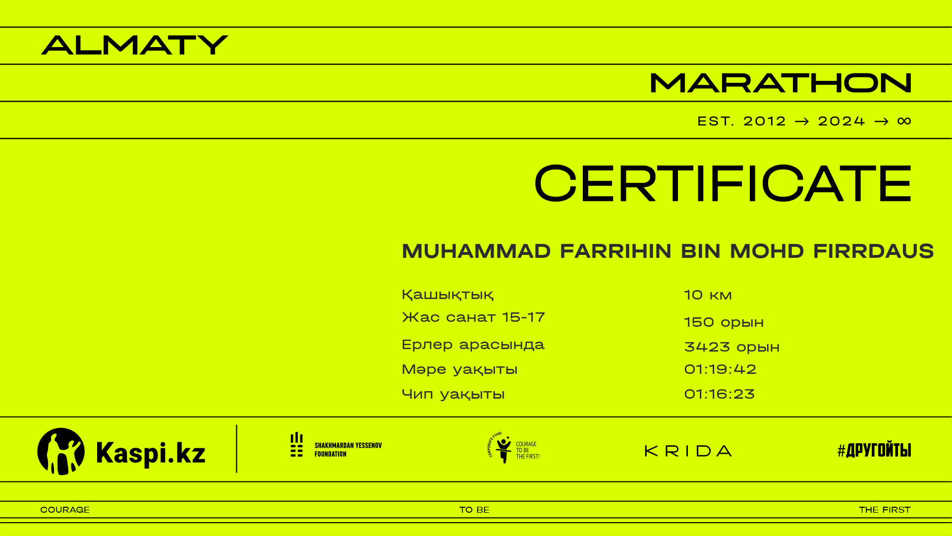 | 5321 | Muhammad Farrihin Bin Mohd Firrdaus | ![]() | Ampang | 11690 | 01:10:45.84 | 01:19:42.40 | 01:16:23.63 | Жүктеп алу |