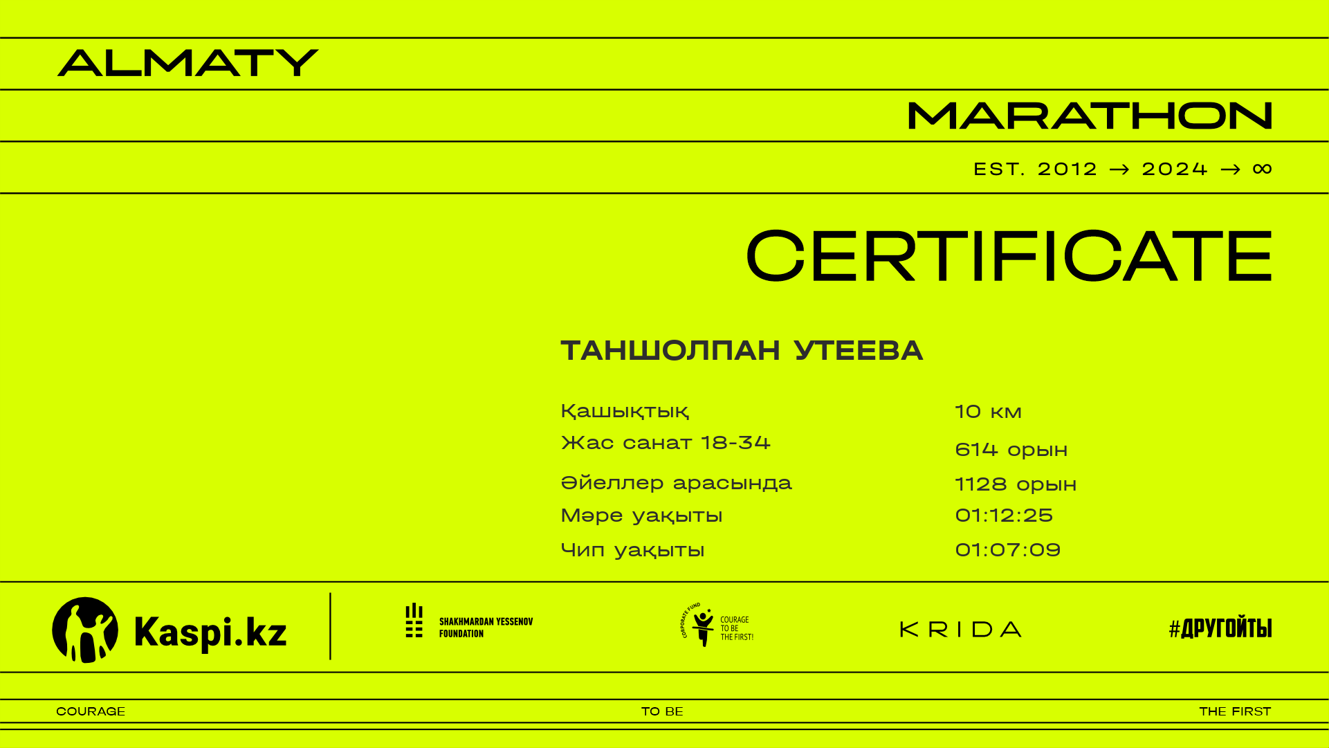 | 8032 | Тамика Досбаева | ![]() | Алматы | 12465 | 01:40:38.85 | 01:53:54.00 | 01:50:21.21 | Жүктеп алу |