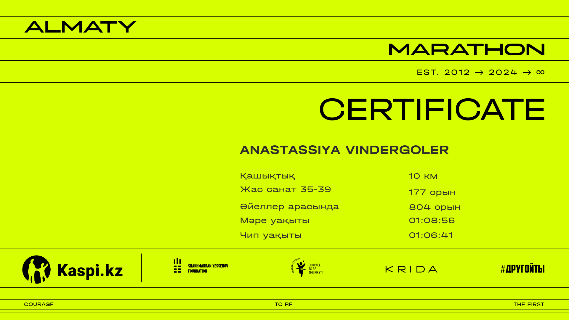 | 3078 | Anastassiya Vindergoler | ![]() | Алматы | 8958 | 01:01:02.69 | 01:08:56.90 | 01:06:41.64 | Жүктеп алу |