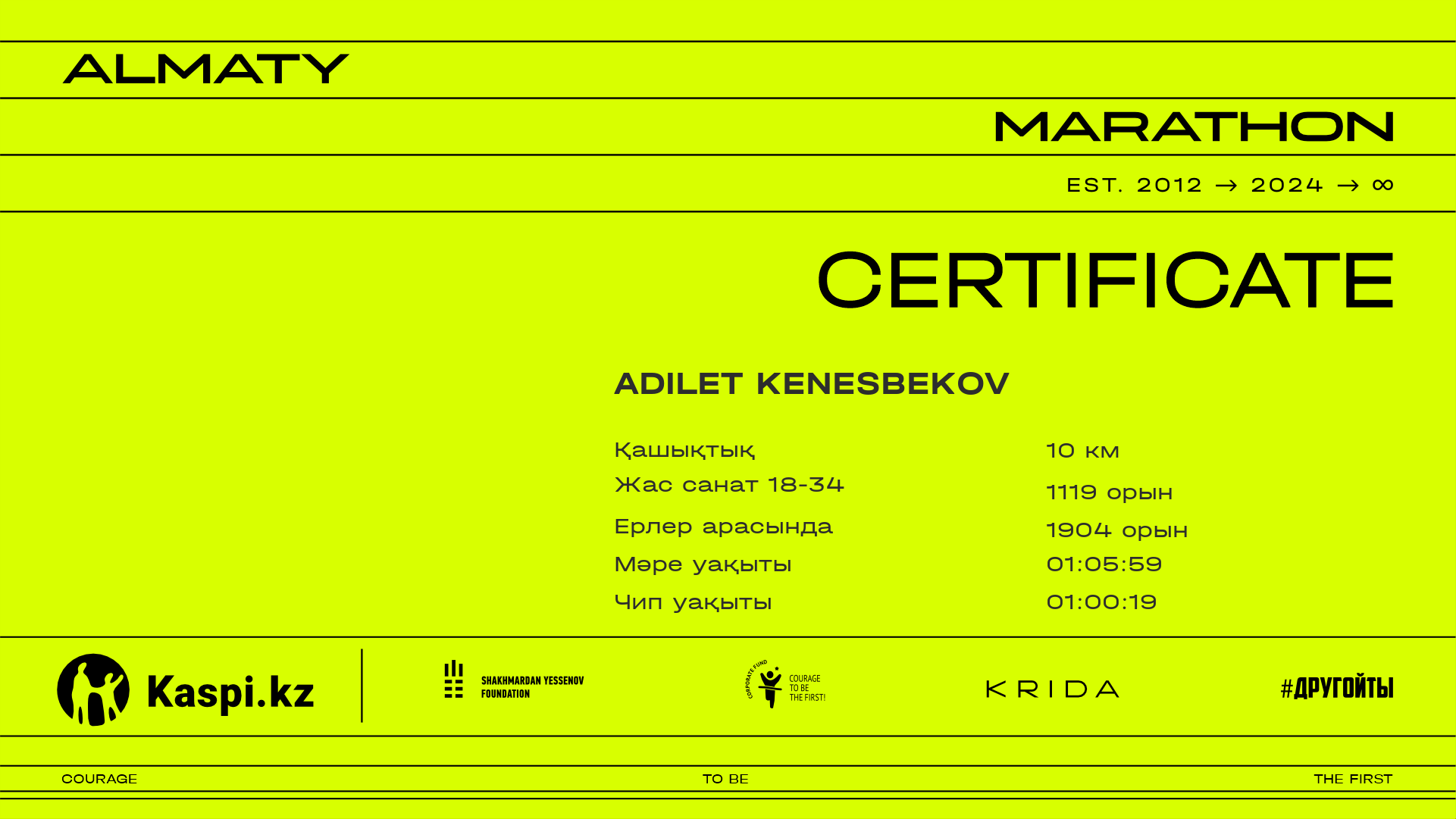 | 2489 | Adilet Kenesbekov | ![]() | Almaty | 13912 | 00:59:17.68 | 01:05:59.54 | 01:00:19.39 | Жүктеп алу |