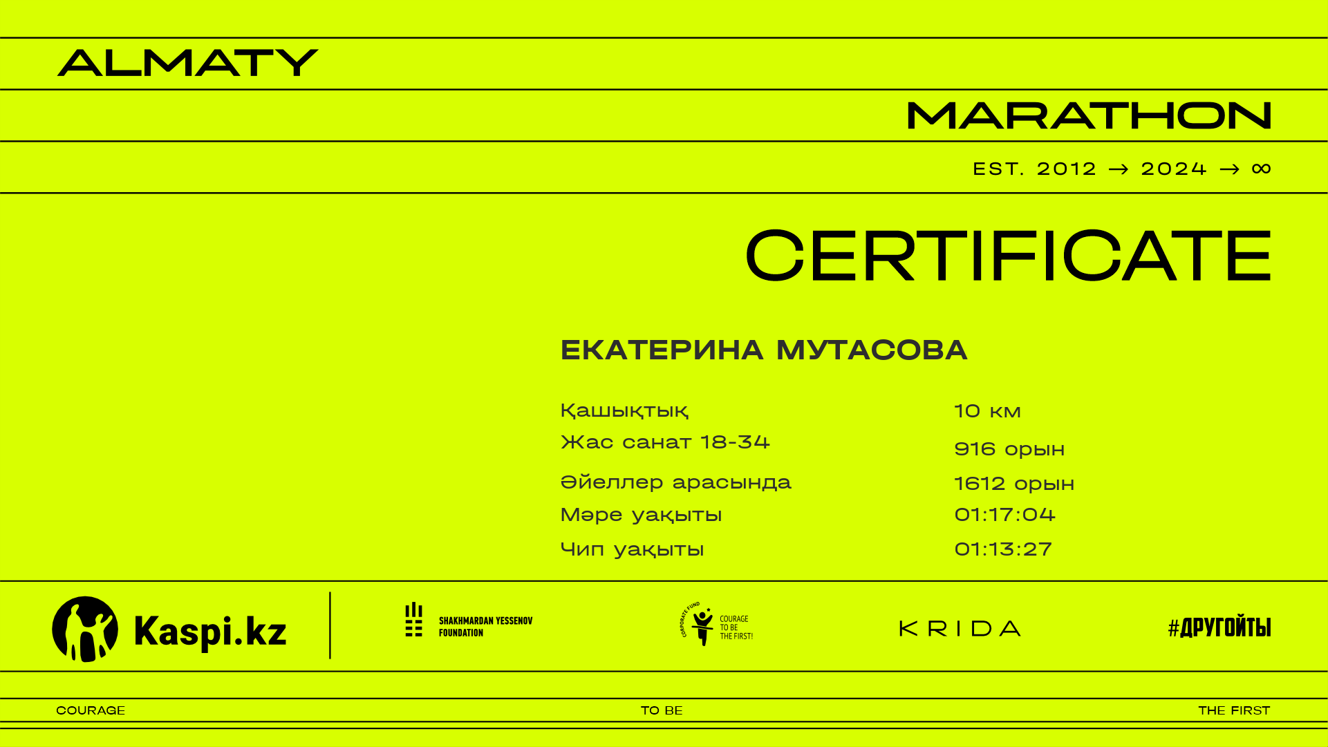 | 4815 | Екатерина Мутасова | ![]() | Алматы | 5588 | 01:07:42.17 | 01:17:04.23 | 01:13:27.08 | Жүктеп алу |