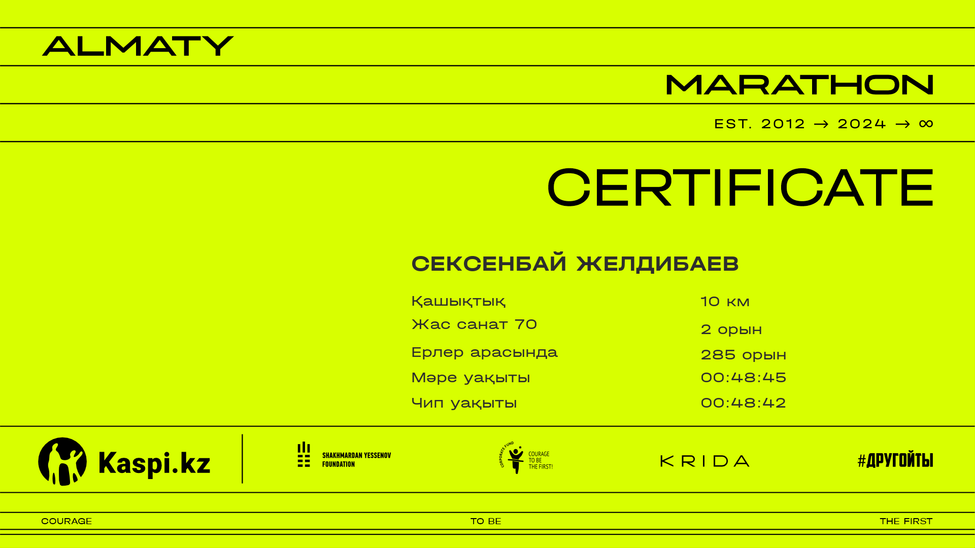 | 331 | Сексенбай Желдибаев | ![]() | Алматы | 8931 | 00:42:13.90 | 00:48:45.24 | 00:48:42.00 | Жүктеп алу |