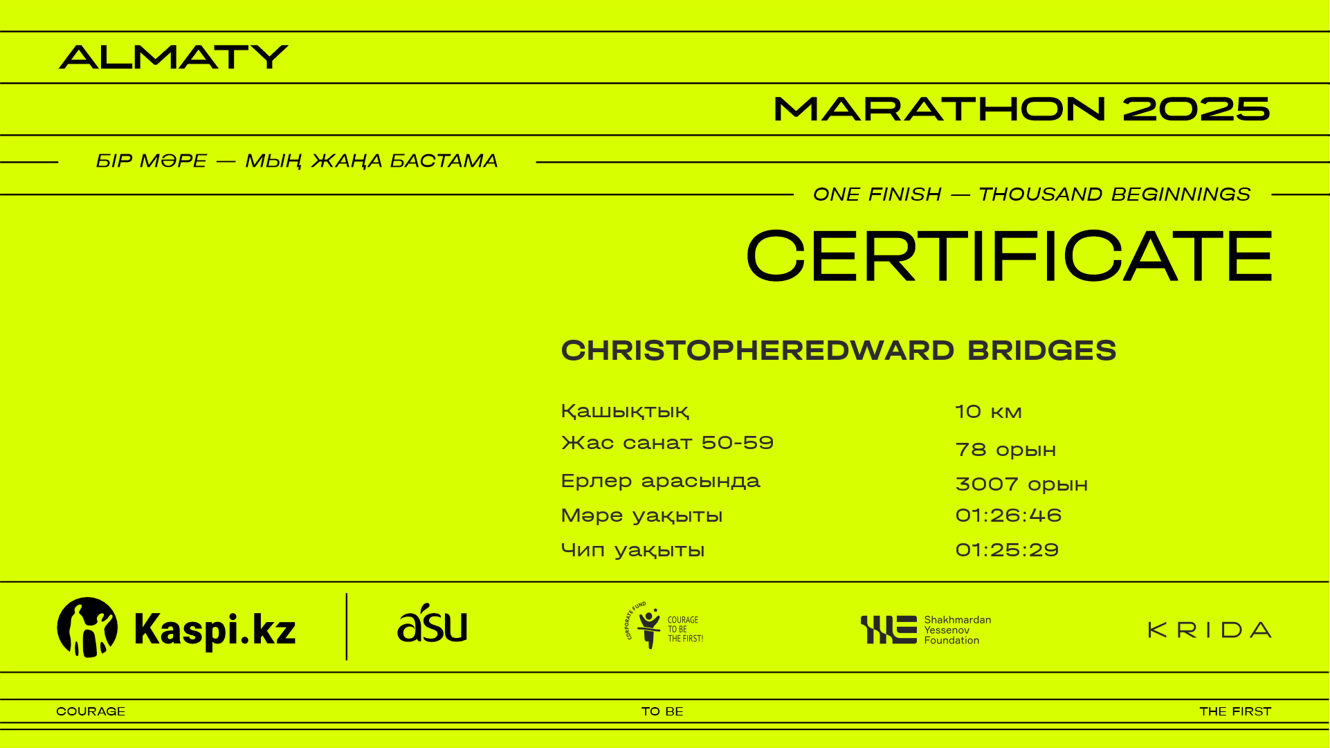 | 5468 | Madina Mayufi | ![]() | Алматы | 14347 | 01:14:30 | 01:25:21 | 01:25:17 | Жүктеп алу |