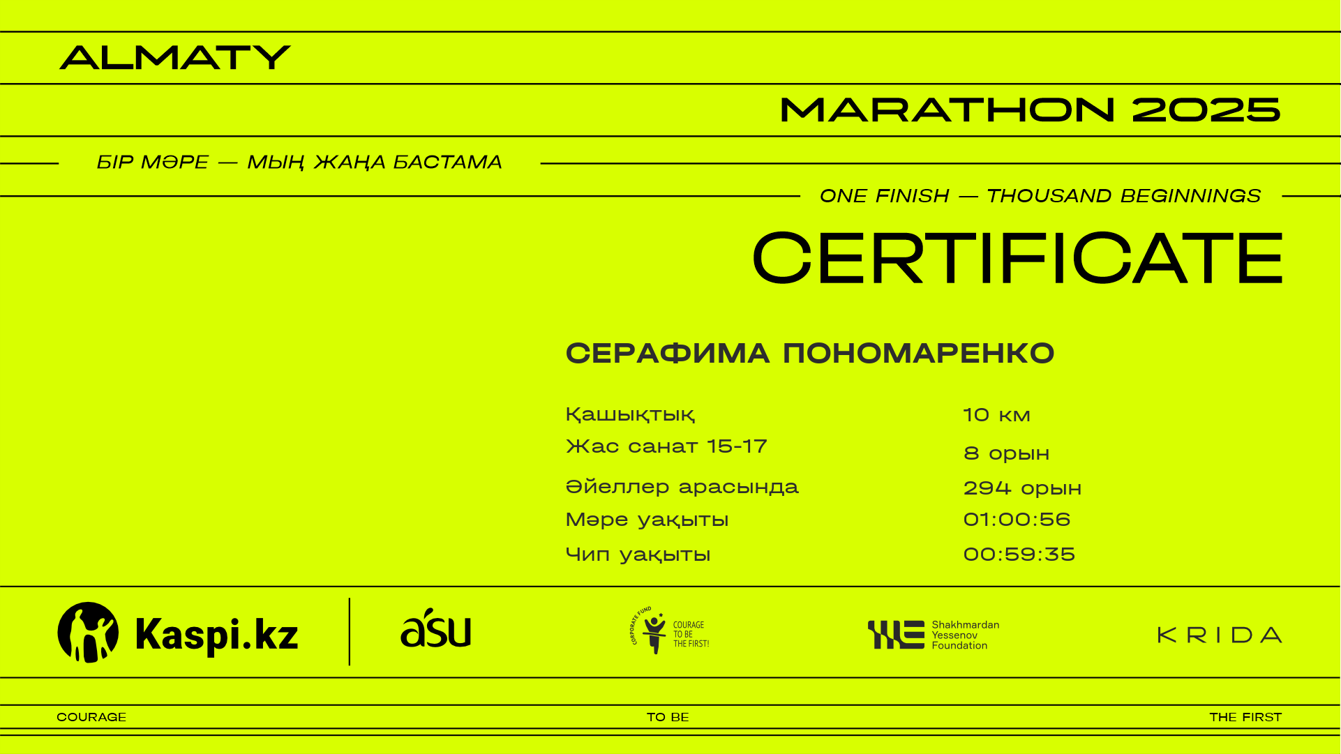 | 294 | Серафима Пономаренко | ![]() | Алматы | 10458 | 00:52:56 | 01:00:56 | 00:59:35 | Жүктеп алу |