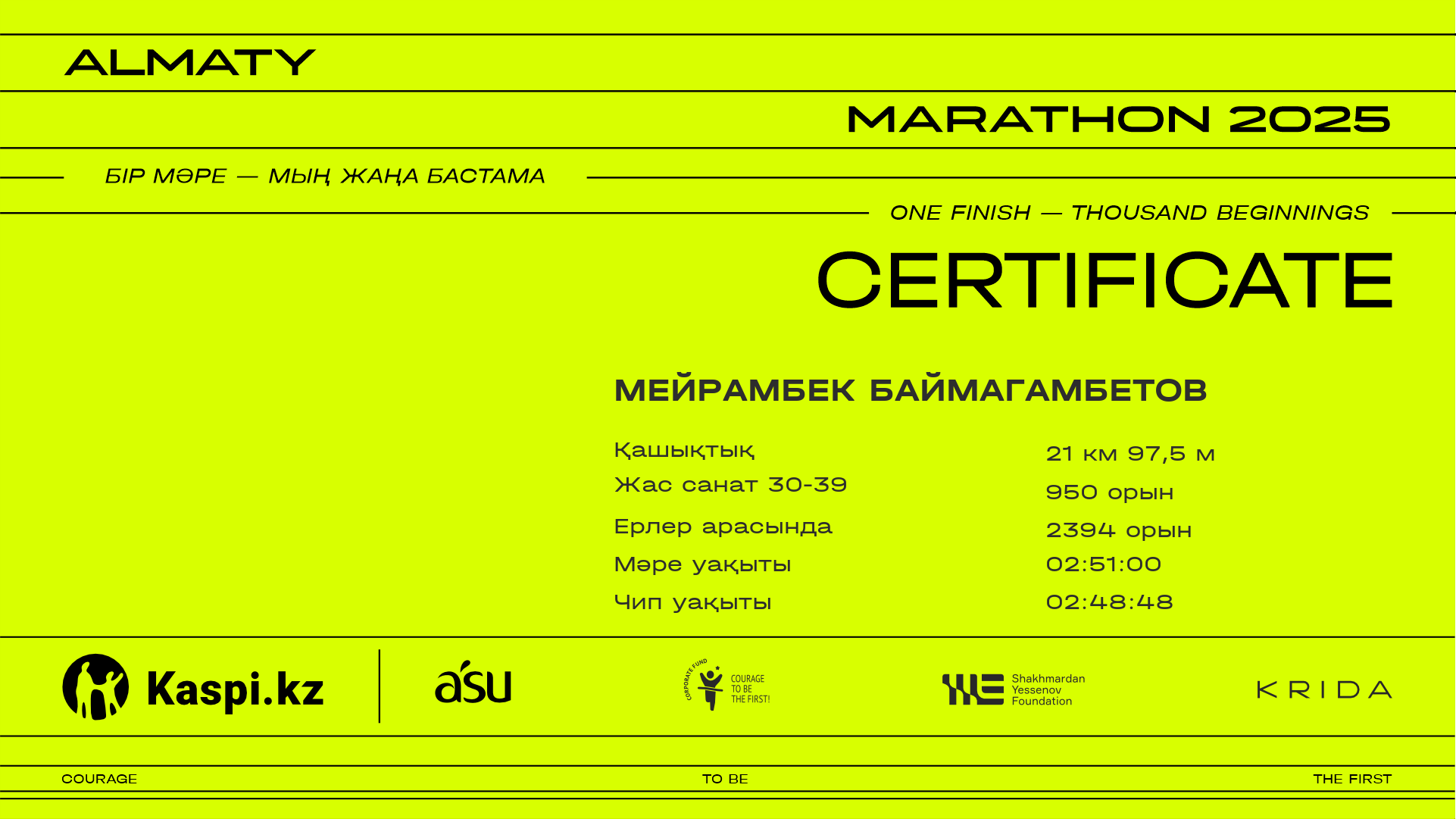 | 3211 | ARSENIY LOZBEN | ![]() | Алматы | 4768 | 00:41:54 | 01:22:03 | 02:00:00 | 02:42:10 | 02:50:53 | 02:48:30 | Жүктеп алу |