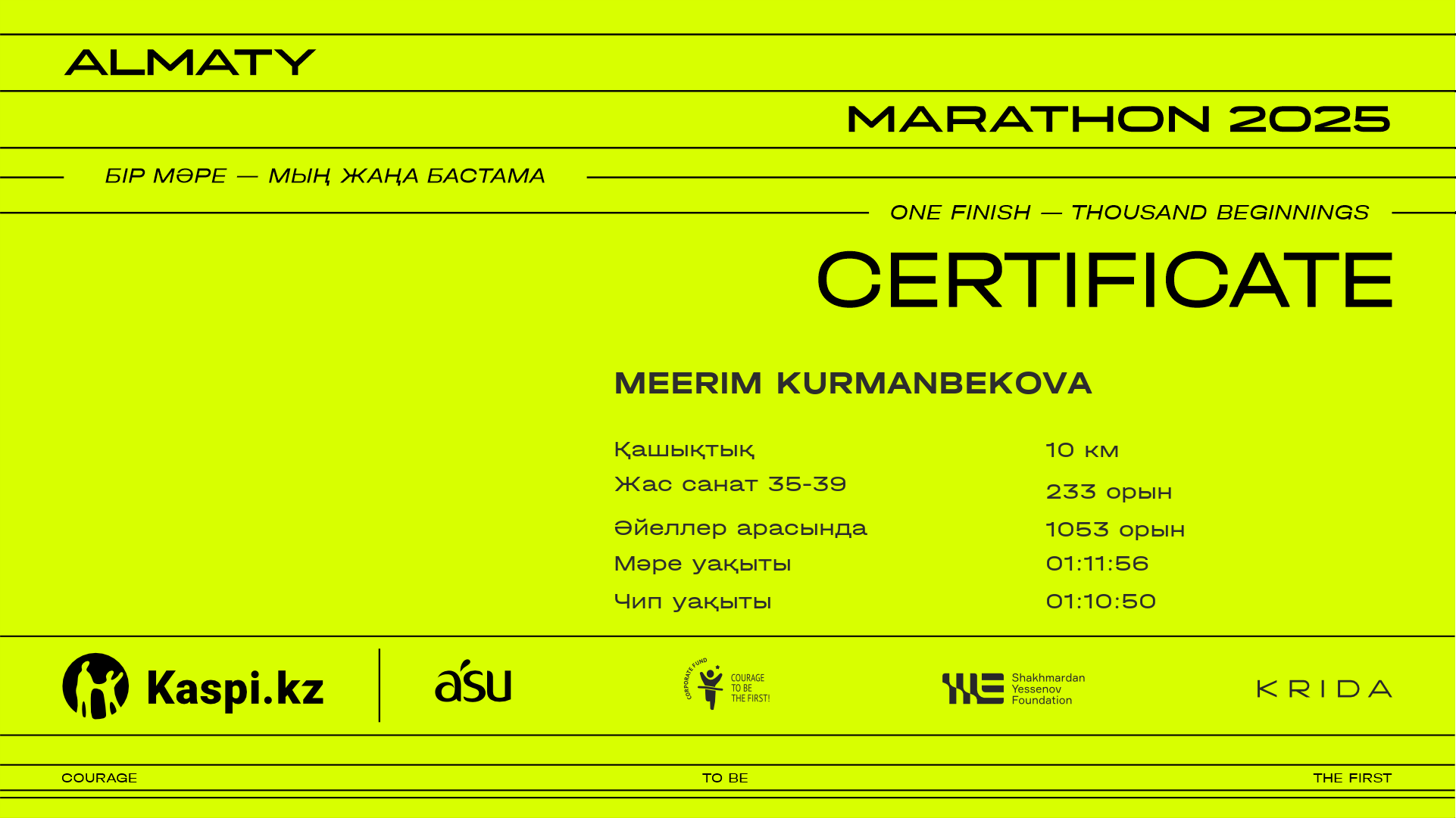 | 1068 | Elmira Akhmetova | ![]() | Алматы | 11341 | 01:01:54 | 01:12:17 | 01:11:01 | Жүктеп алу |