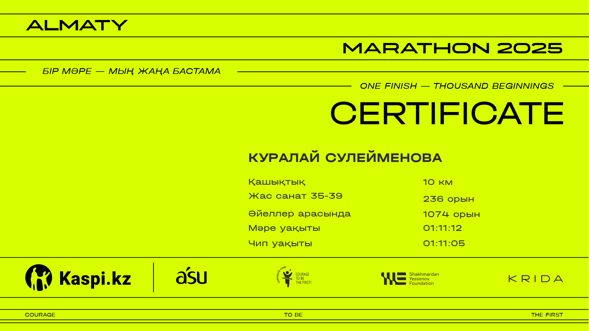 | 1074 | Куралай Сулейменова | ![]() | Алматы | 6921 | 01:02:00 | 01:11:12 | 01:11:05 | Жүктеп алу |