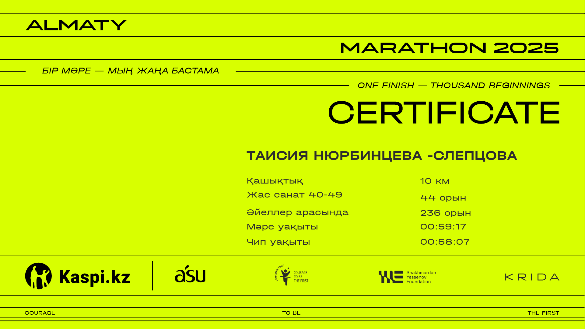 | 233 | Альбина Оралбай | ![]() | Алматы | 6345 | 00:50:59 | 00:58:08 | 00:58:03 | Жүктеп алу |