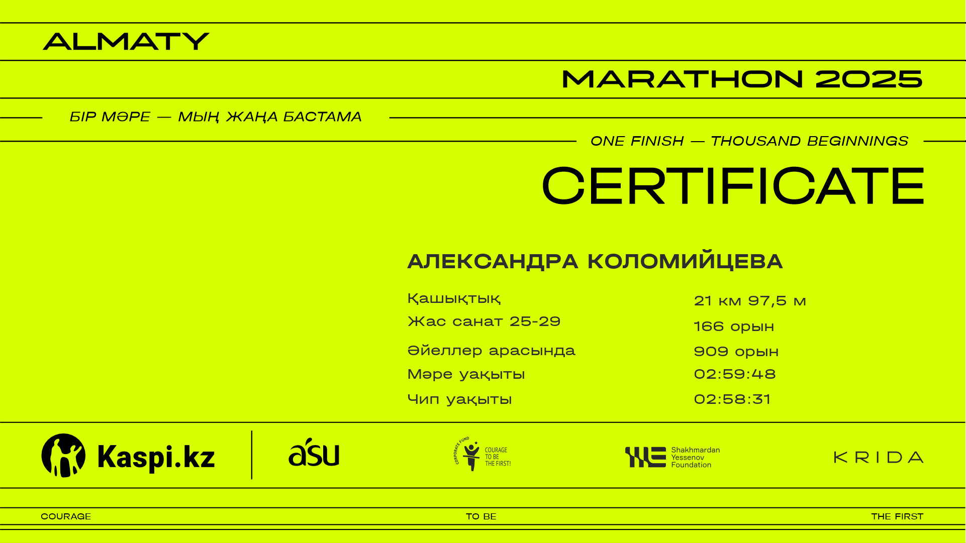 | 3429 | Александра Коломийцева | ![]() | Алматы | 5307 | 00:43:52 | 01:26:56 | 02:06:38 | 02:51:12 | 02:59:48 | 02:58:31 | Жүктеп алу |