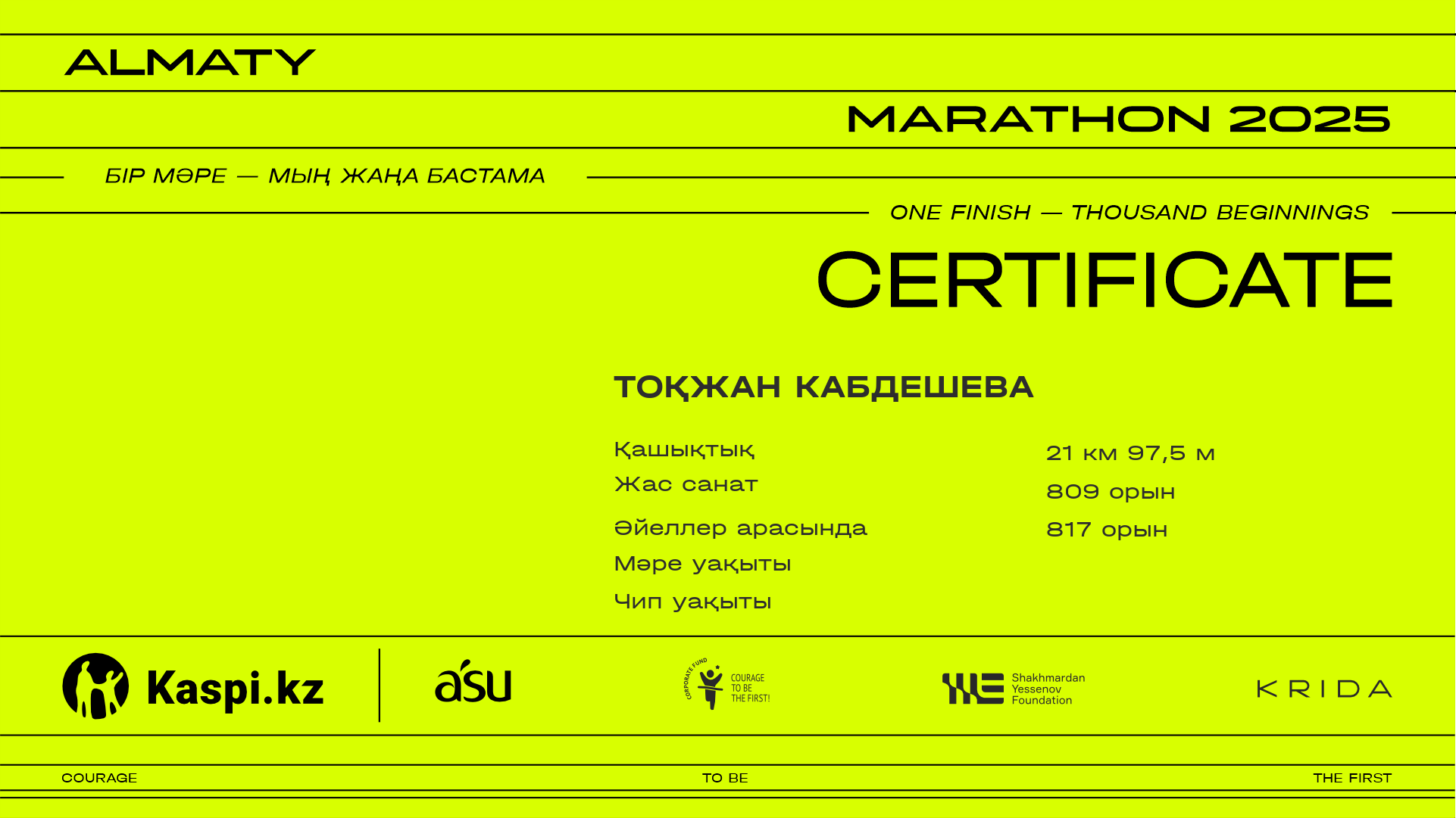 | Орын | Қатысушы | Ел | Қала | Нөмір | 5 km | 10 km | 15 km | 20 km | Финиш | Уақыт чипі | Сертификат |