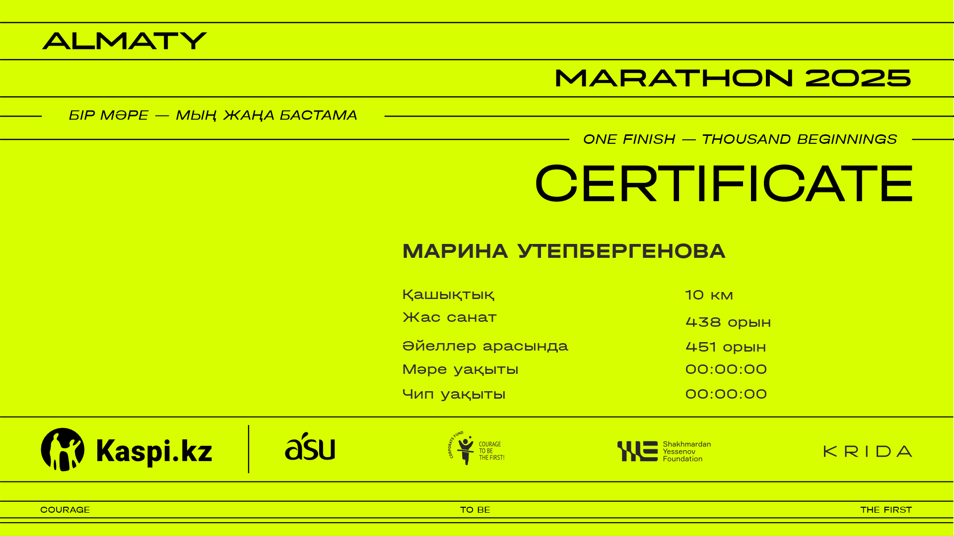 | 1546 | Меруерт Шабден | ![]() | Алматы | 6187 | 01:06:22 | 01:17:27 | 01:15:48 | Жүктеп алу |