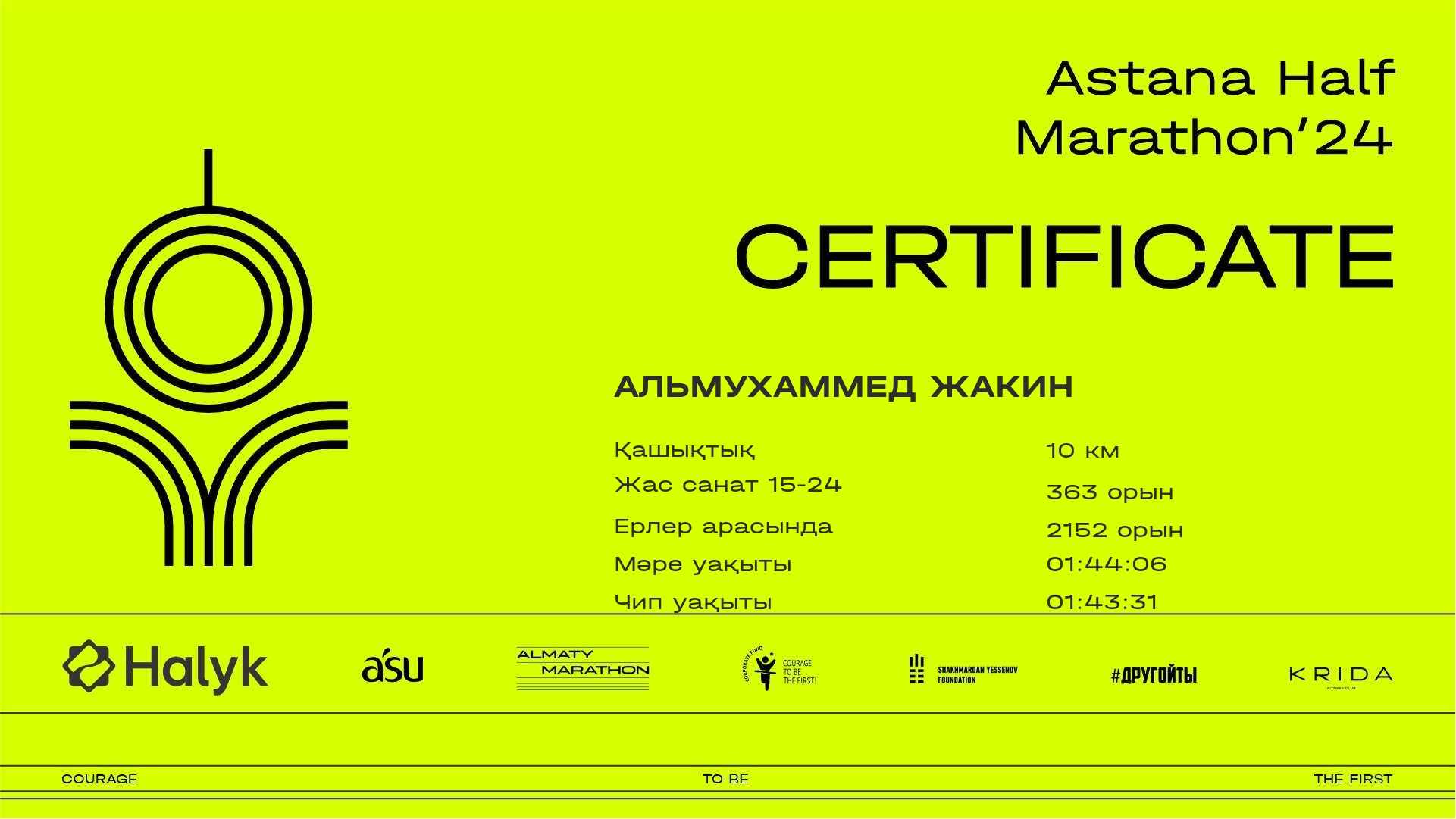 | 3649 | Малика Жумажан | ![]() | Астана | 3847 | 00:45:39.57 | 01:34:23.44 | 01:44:23.55 | 01:41:21.95 | Жүктеп алу |
