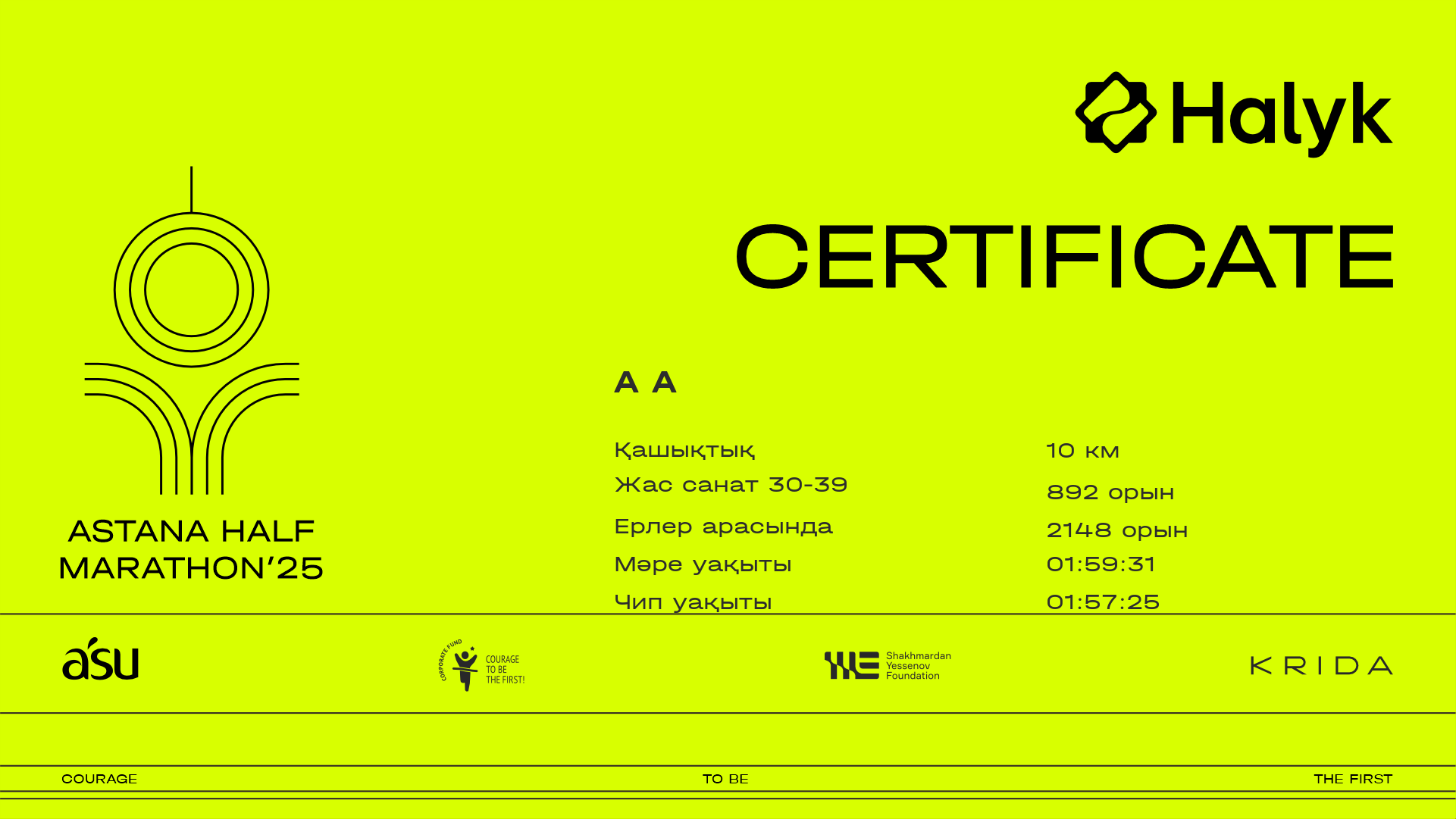 | 3729 | Айдана Абжанова | ![]() | Астана | 6294 | 00:56:10 | 01:50:13 | 01:49:22 | Жүктеп алу |