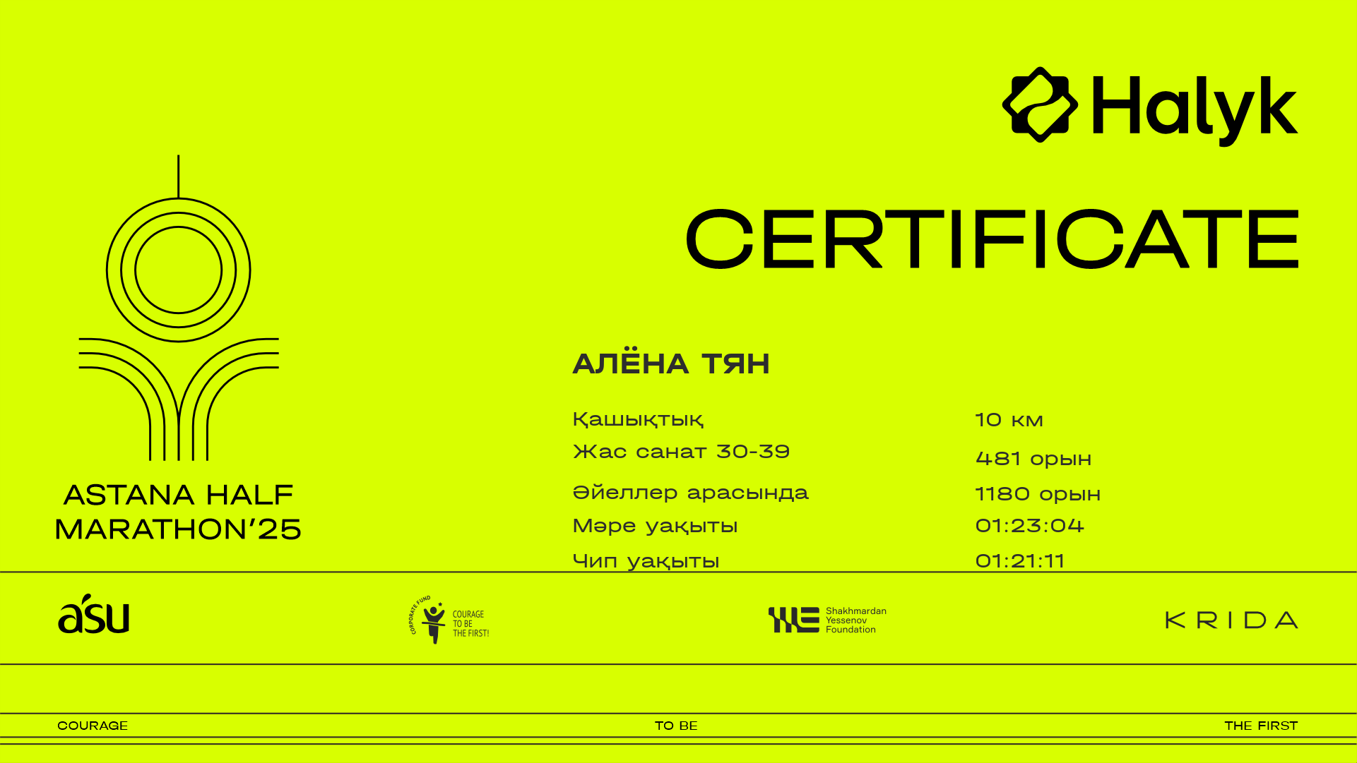 | 3187 | Ясмин Турсунханова | ![]() | Астана | 4958 | 00:47:33 | 01:23:01 | 01:21:14 | Жүктеп алу |