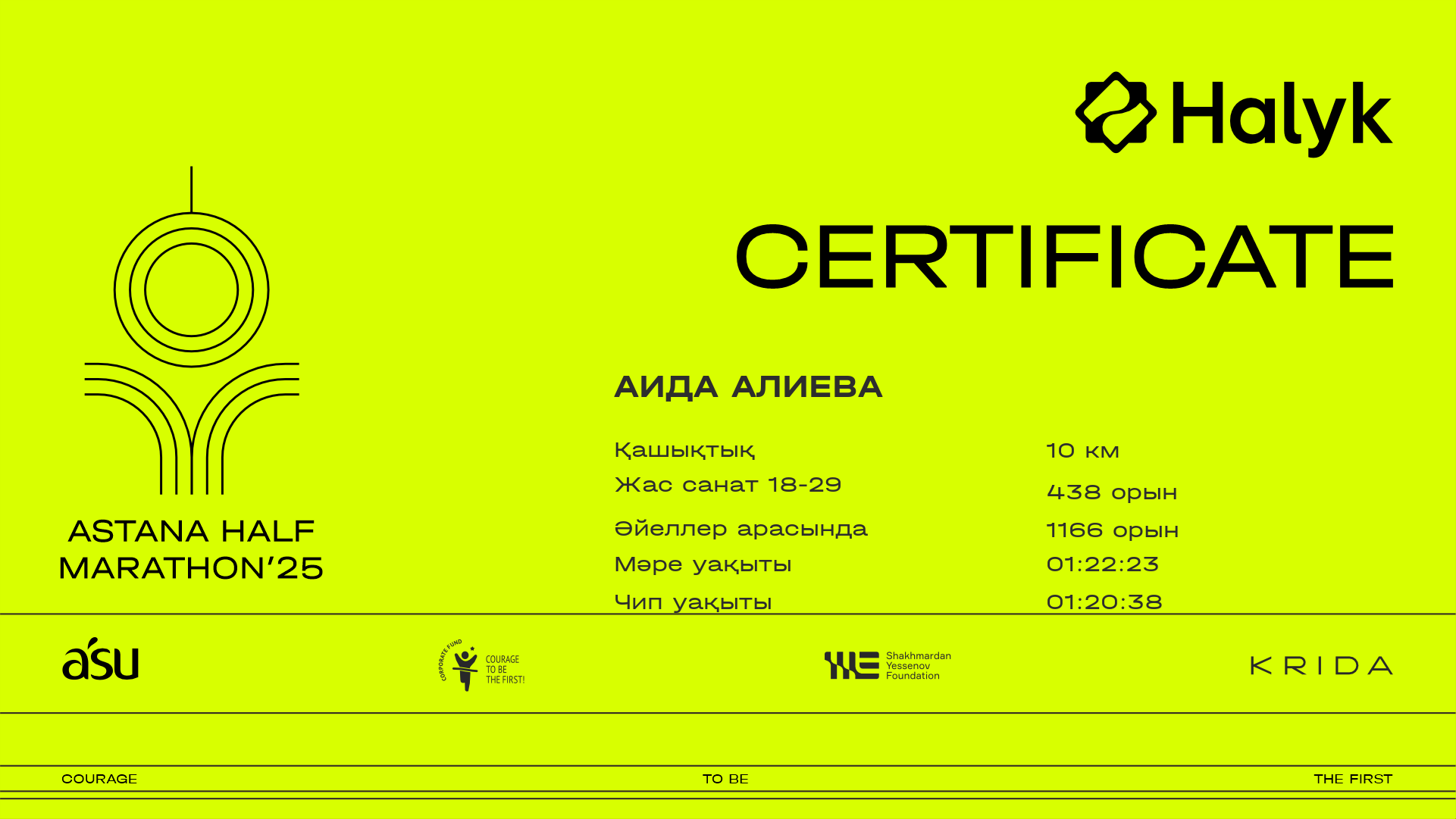 | 3163 | Аида Алиева | ![]() | Астана | 3062 | 00:47:15 | 01:22:23 | 01:20:38 | Жүктеп алу |