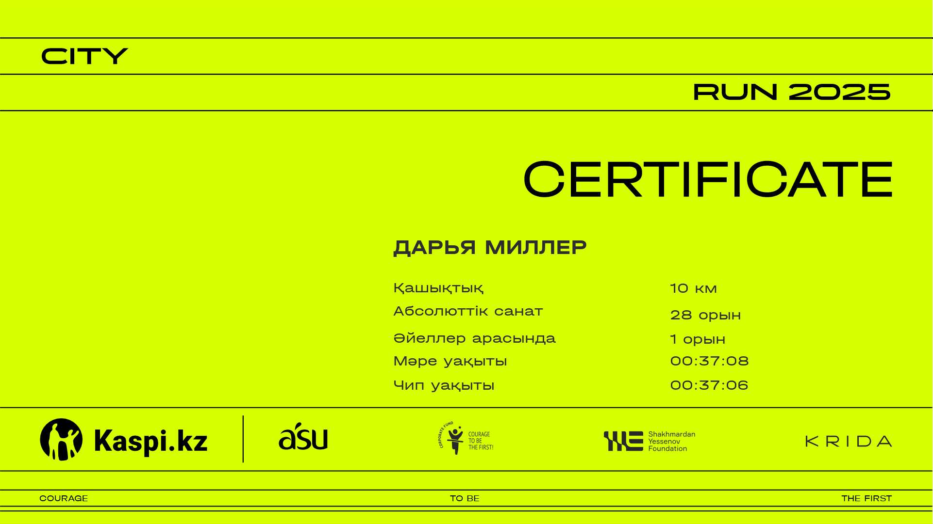 | 28 | Дарья Миллер | ![]() | Алматы | 104 | 00:09:33 | 00:16:12 | 00:23:22 | 00:30:37 | 00:36:17 | 00:37:08 | 00:37:06 | Жүктеп алу |