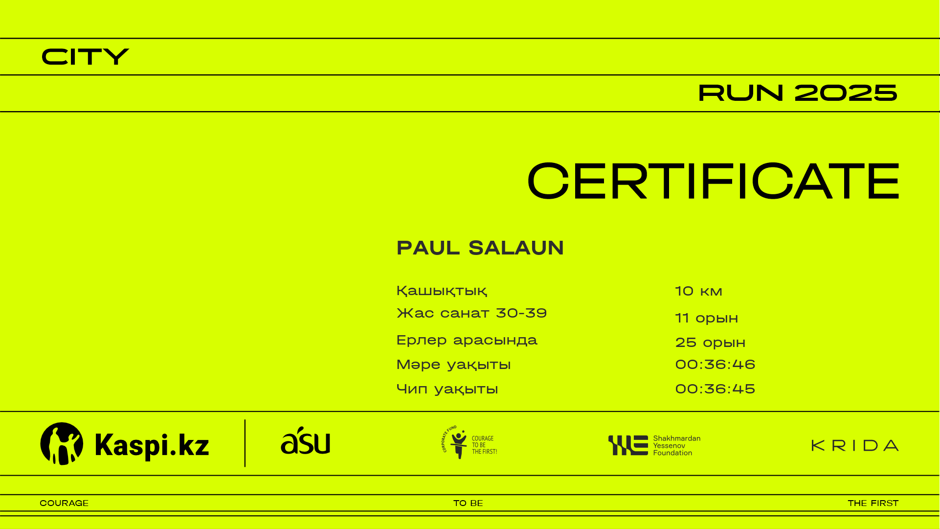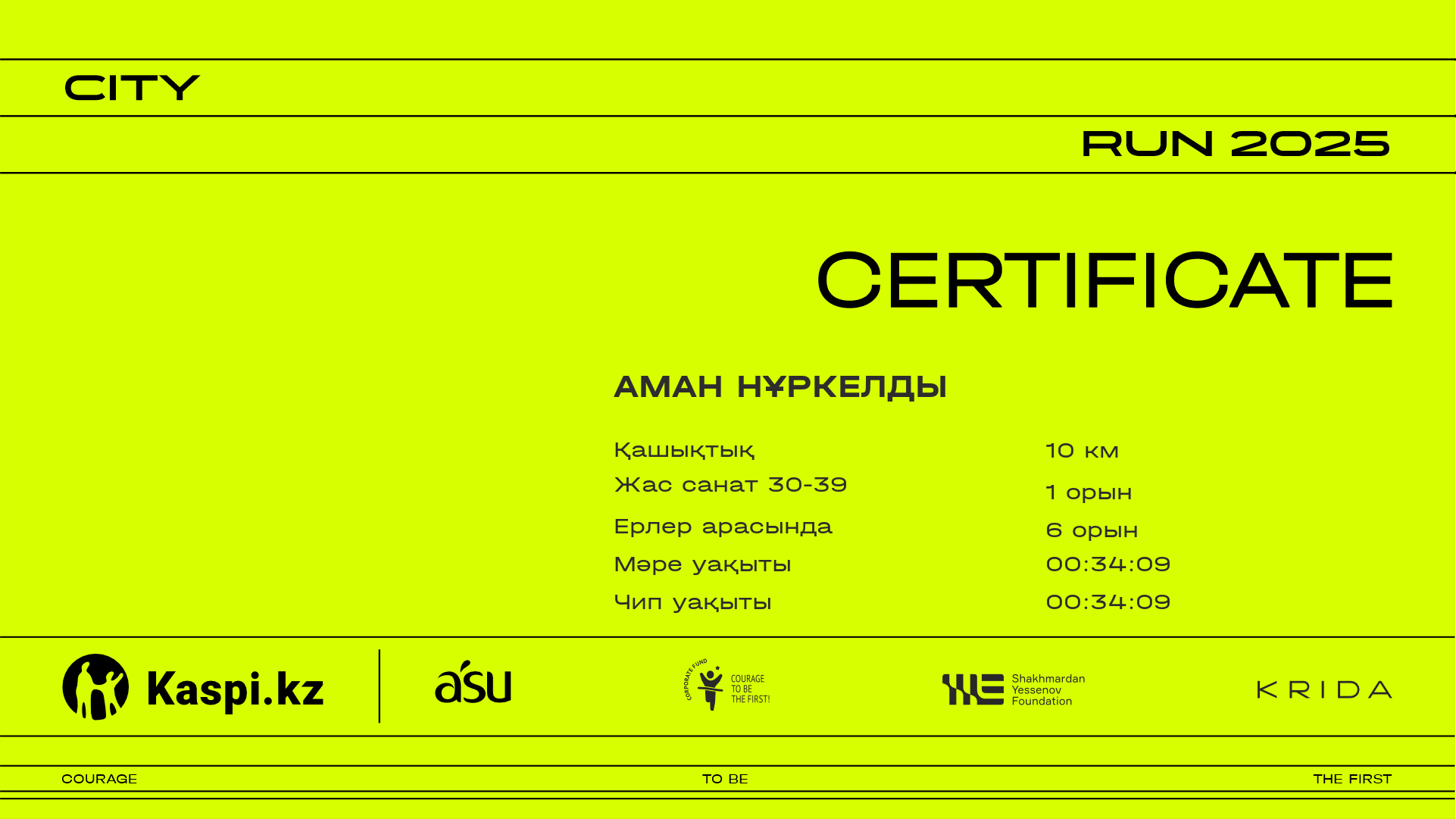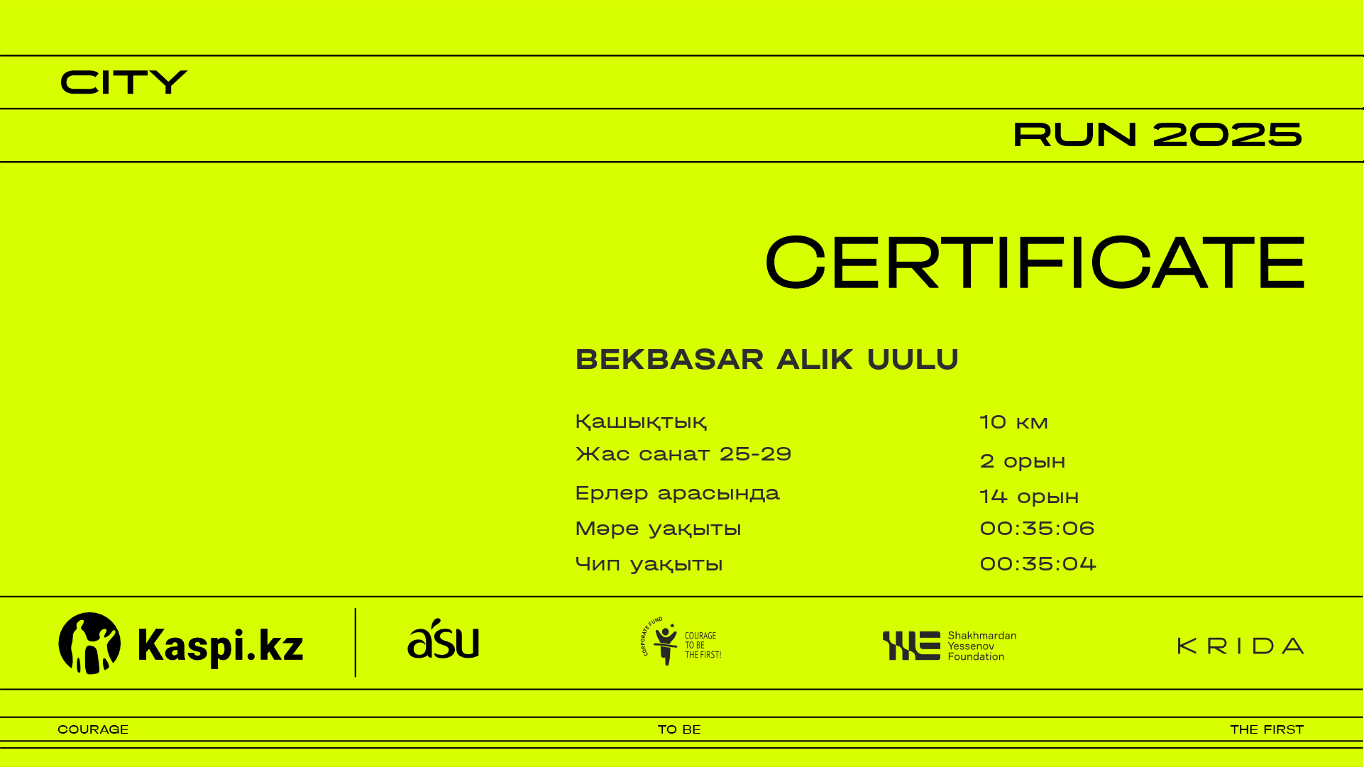 | 5 | Akimzhan Yelekenov | ![]() | Almaty | 1120 | 00:08:25 | 00:14:30 | 00:21:10 | 00:27:58 | 00:32:55 | 00:33:42 | 00:33:41 | Жүктеп алу |
