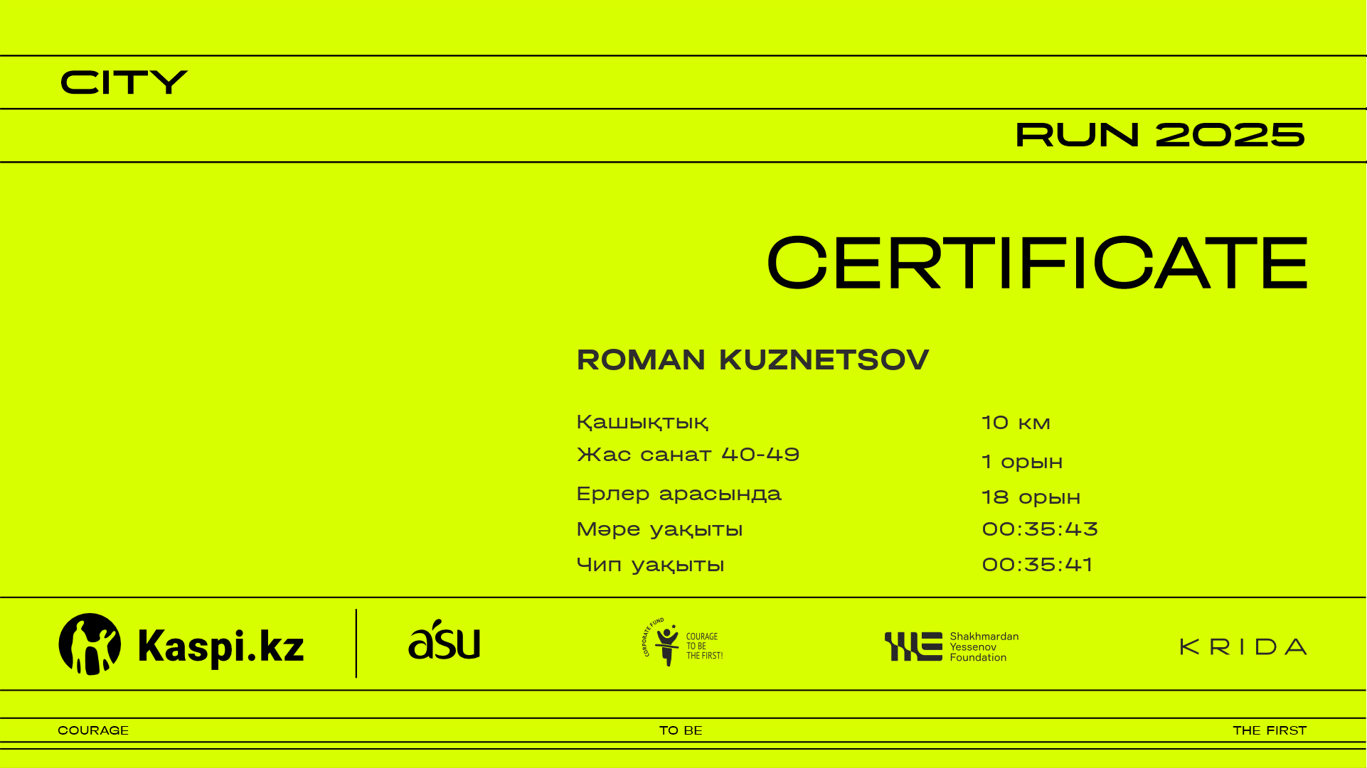 | 18 | Roman Kuznetsov | ![]() | Алматы | 1893 | 00:08:49 | 00:15:13 | 00:22:10 | 00:29:17 | 00:34:51 | 00:35:43 | 00:35:41 | Жүктеп алу |
