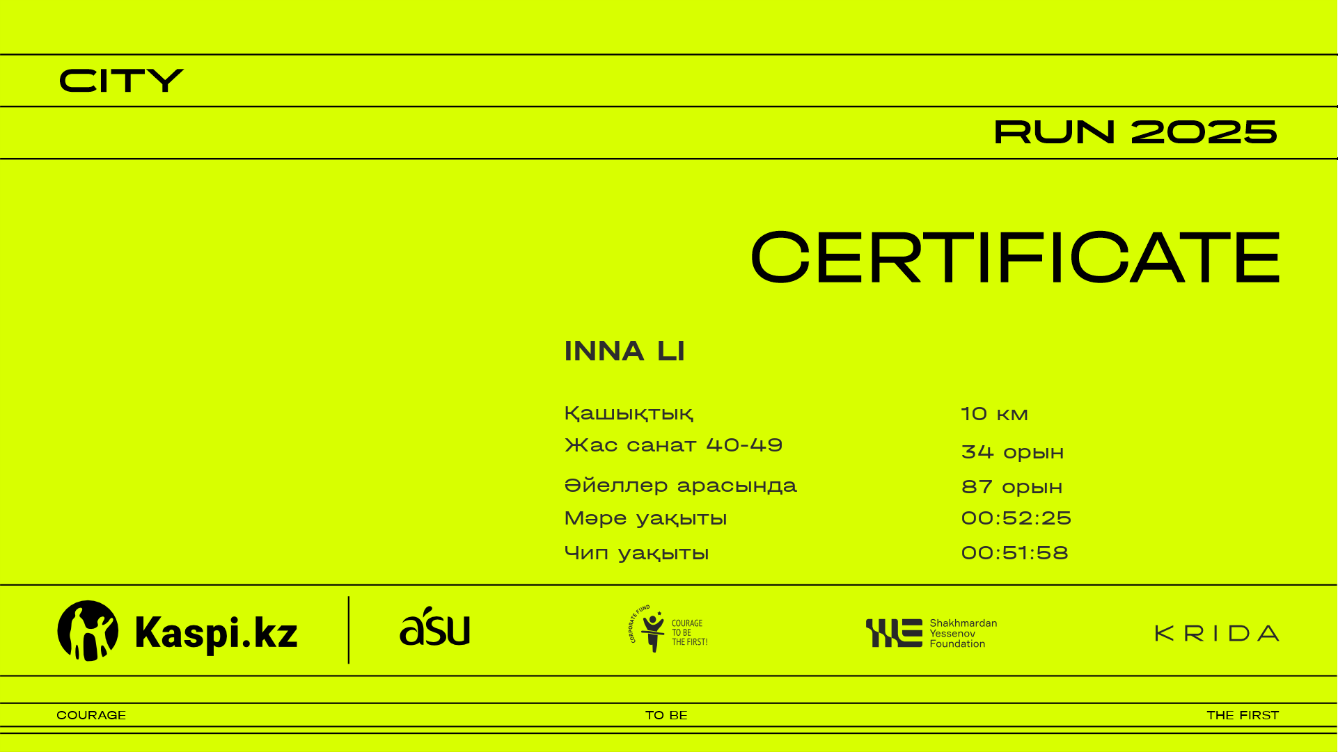 | 1658 | Janelle Abildayeva | ![]() | Almaty | 597 | 00:20:16 | 00:34:00 | 00:48:43 | 01:03:54 | 01:15:23 | 01:16:54 | 01:16:00 | Жүктеп алу |