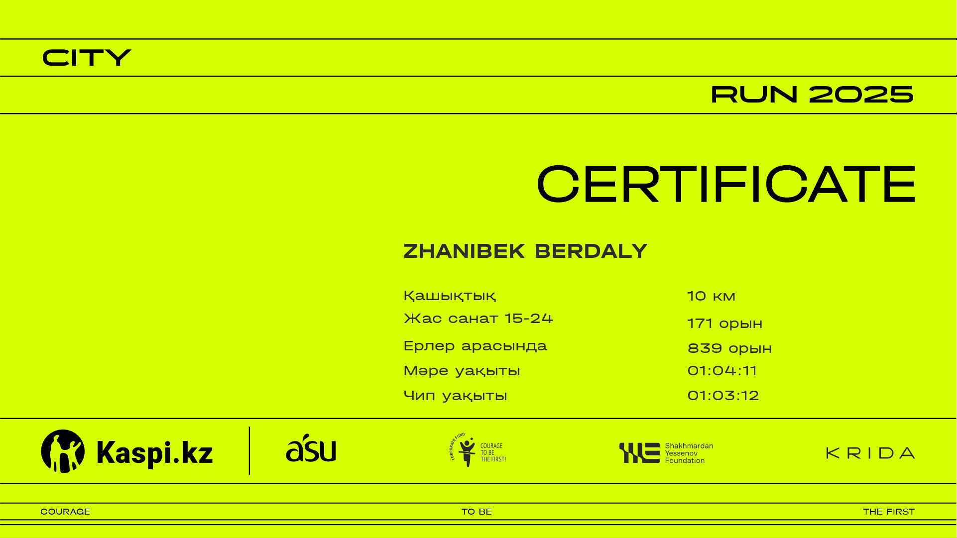 | 1826 | Yeradilet Ashim | ![]() | Алматы | 853 | 00:24:20 | 00:38:42 | 00:54:52 | 01:11:54 | 01:25:04 | 01:20:33 | Жүктеп алу | |