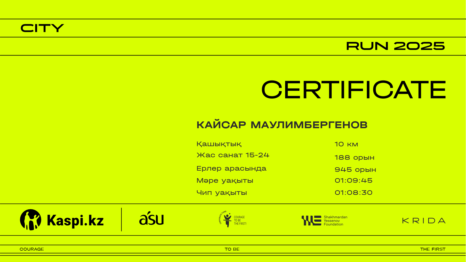 | 1402 | Кайсар Маулимбергенов | ![]() | Алматы | 946 | 00:18:14 | 00:30:00 | 00:43:17 | 00:57:23 | 01:08:22 | 01:09:45 | 01:08:30 | Жүктеп алу |